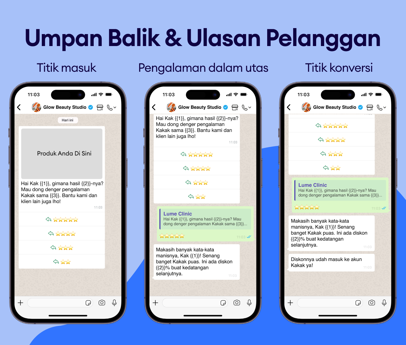 Kumpulkan ulasan dan feedback melalui pesan WhatsApp otomatis setelah kunjungan atau pembelian klien untuk komunikasi end-to-end.