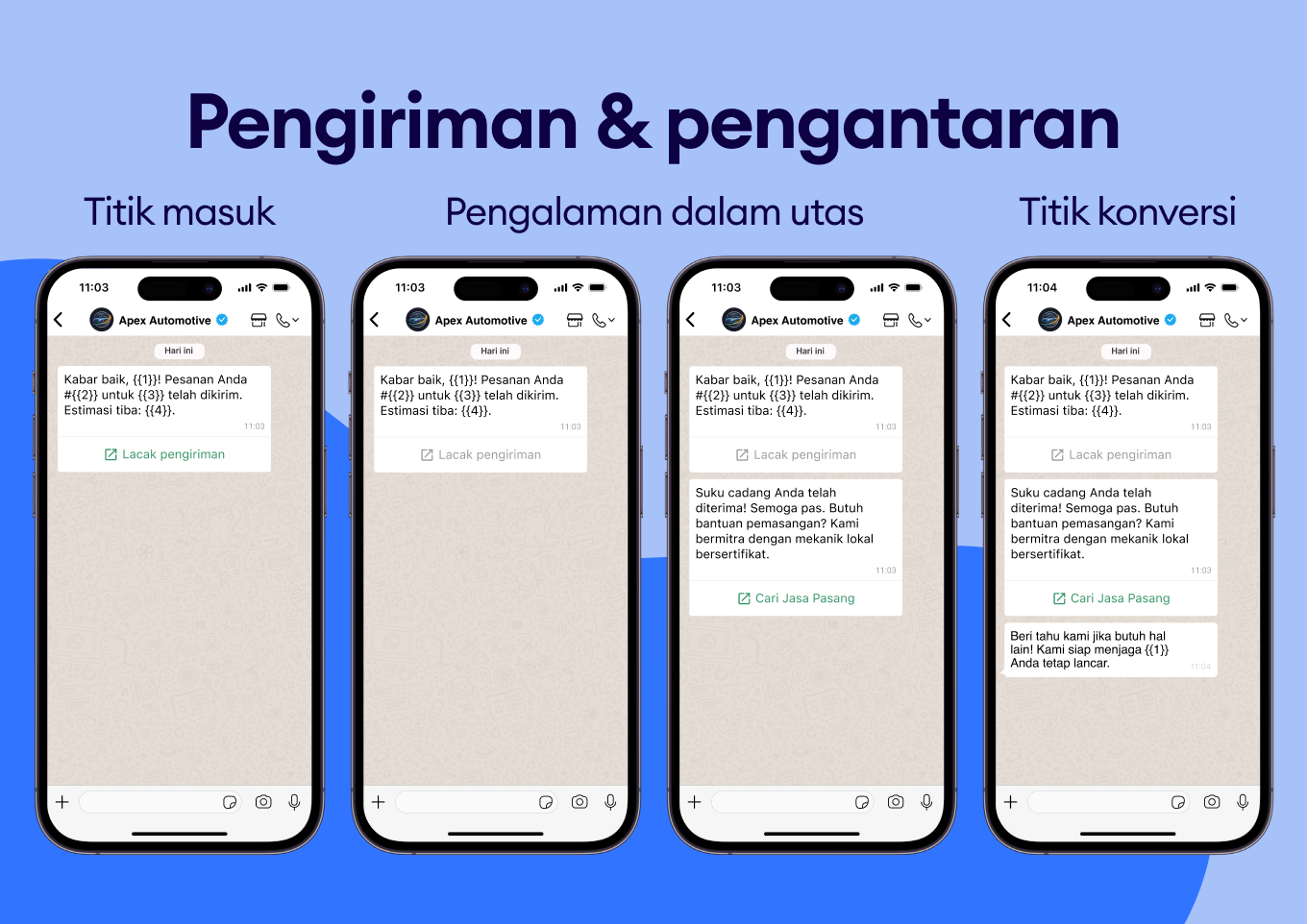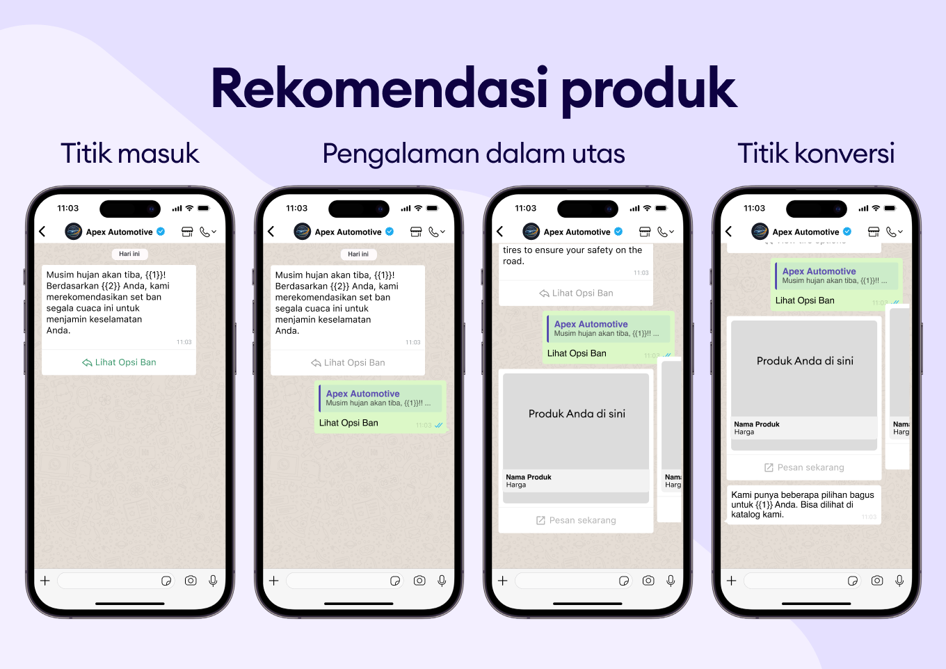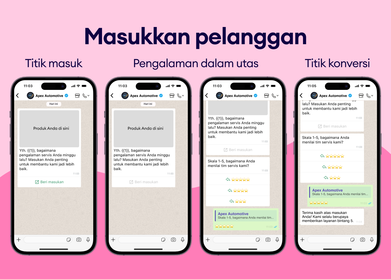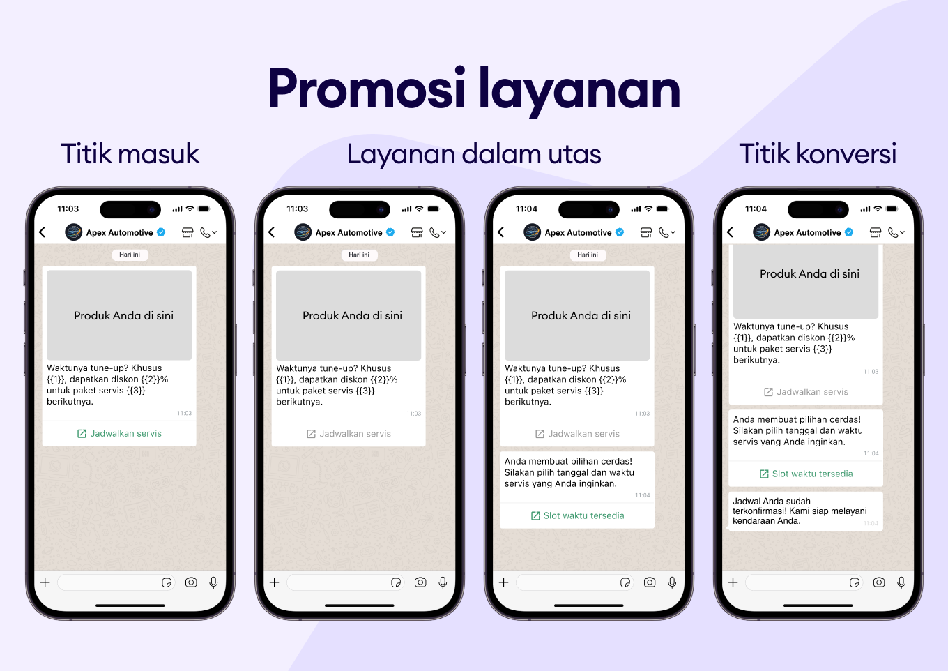 Libatkan pelanggan dengan pesan WhatsApp yang dipersonalisasi untuk merekomendasikan upgrade atau layanan tambahan yang relevan.