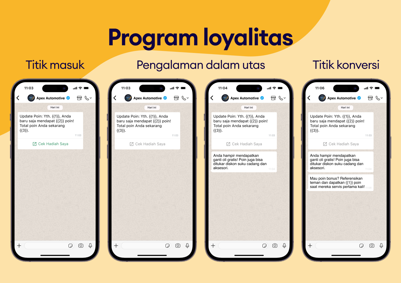 Beri tahu pelanggan secara otomatis tentang poin yang diperoleh, keuntungan member, dan penawaran eksklusif untuk mendorong servis atau pembelian berikutnya.