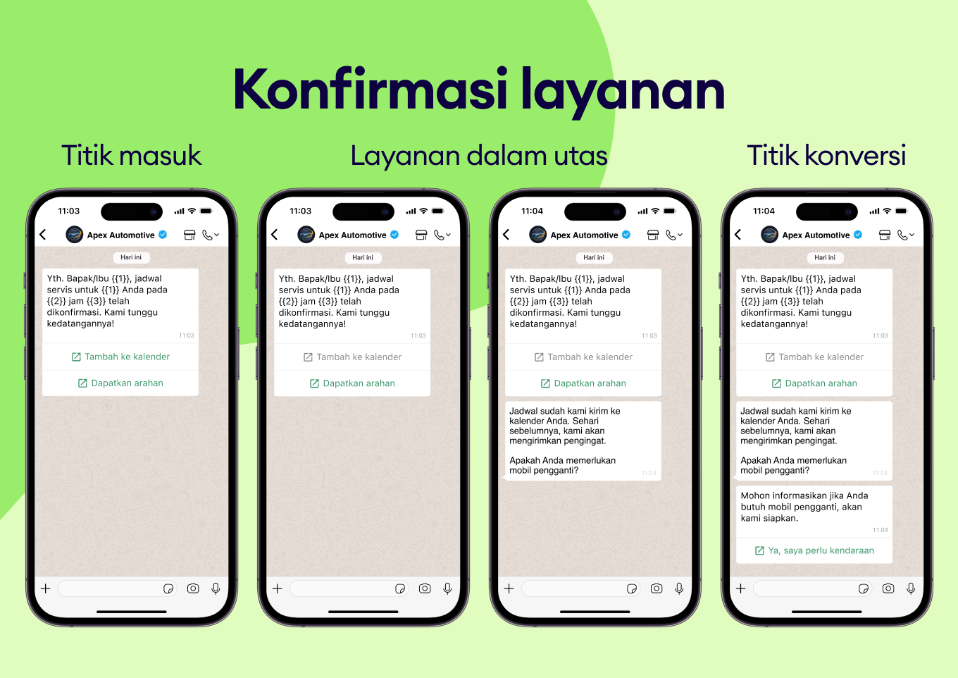 Gunakan template WhatsApp dalam alur kerja kamu saat ini untuk memastikan pengalaman yang lancar dari proses booking hingga follow-up.