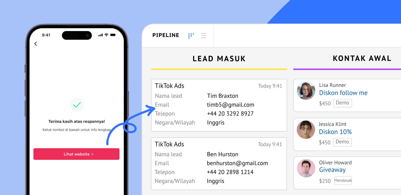 Integrasi ini mengubah klik iklan TikTok menjadi peluang bisnis nyata — sehingga timmu bisa follow up lebih cepat, tetap teratur, dan menghasilkan lebih banyak revenue.