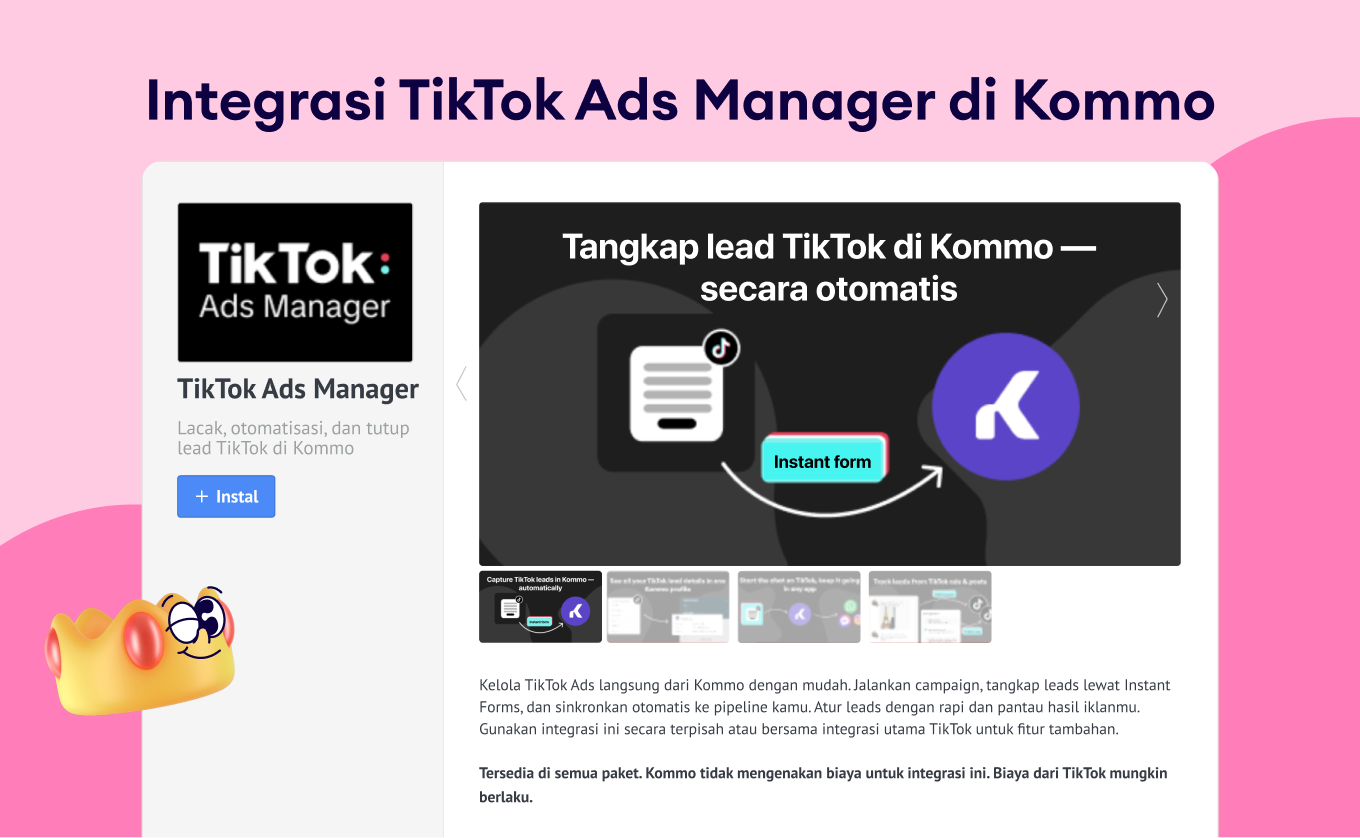 📍Kunjungi panduan setup kami untuk melihat lebih detail cara menghubungkan TikTok Ads Manager ke Kommo.