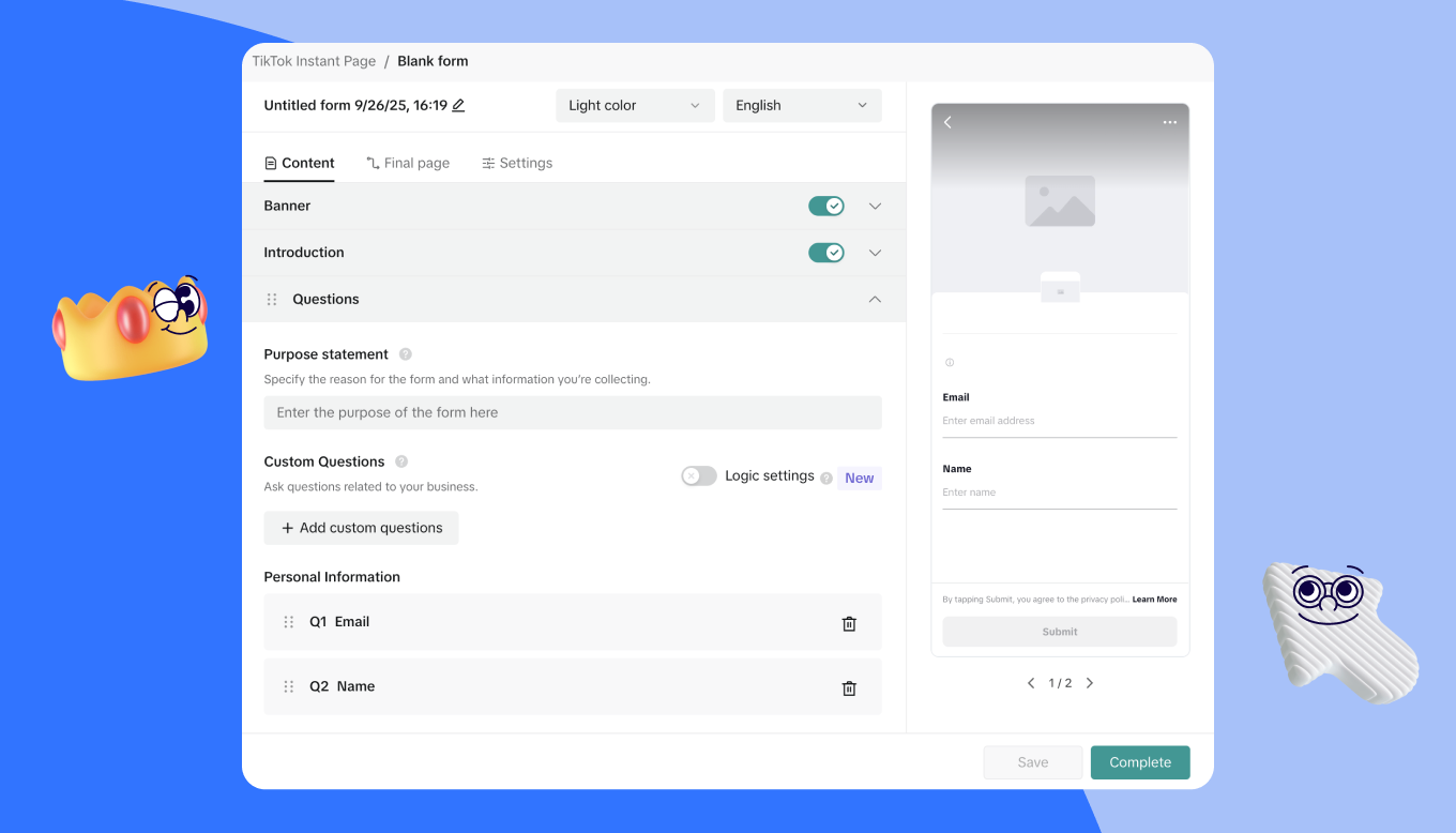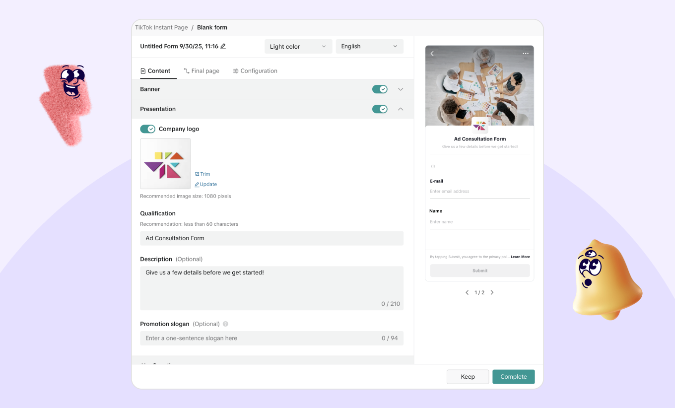 - Di TikTok, buka TikTok Ads Manager > Tools > Leads > Instant Form > Create
