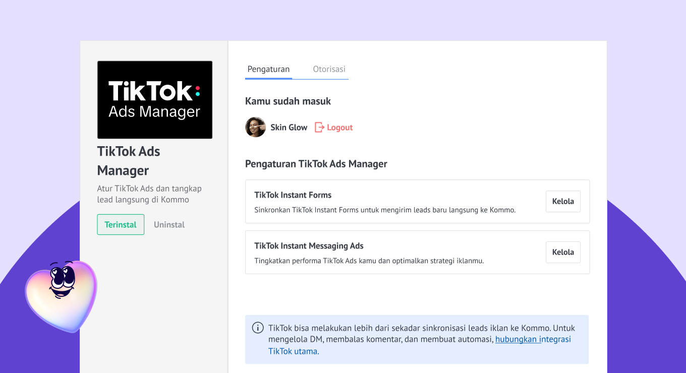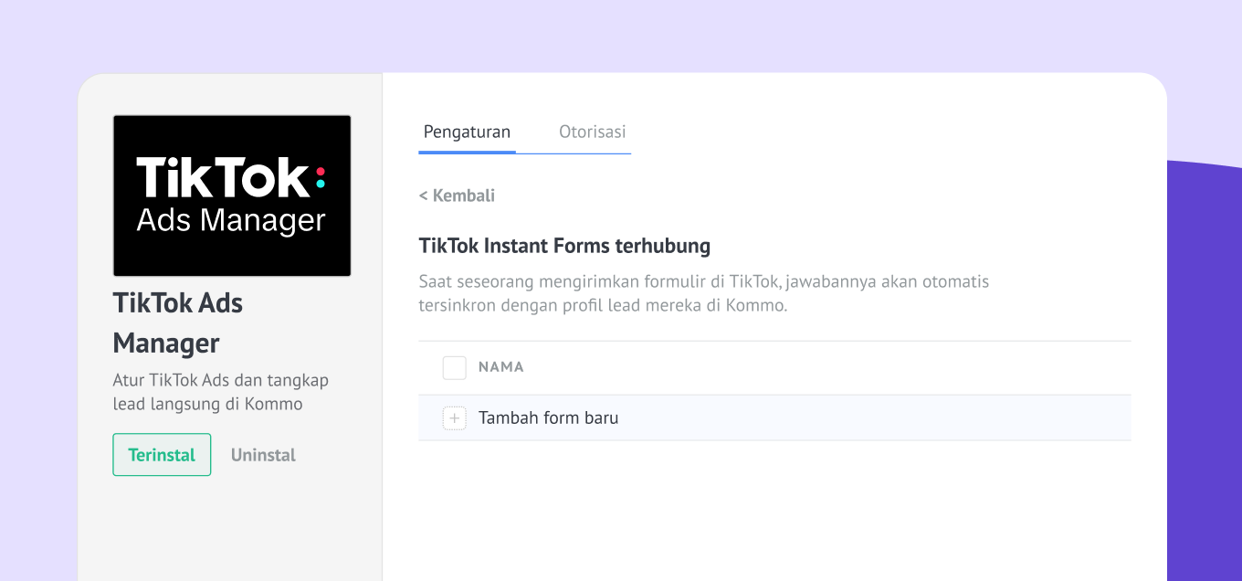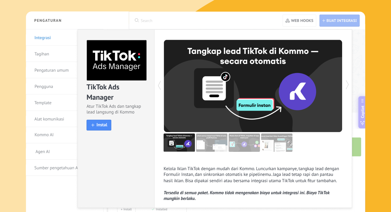 - Di Kommo, buka Pengaturan > Integrasi > TikTok Ads Manager > Instal