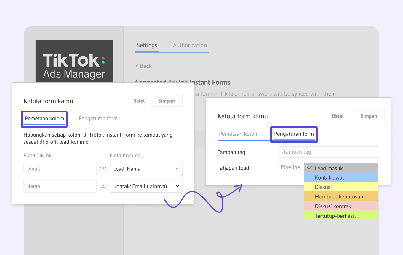 - Pilih TikTok Instant Form-mu > petakan field/kolom > tetapkan pipeline dan tag.