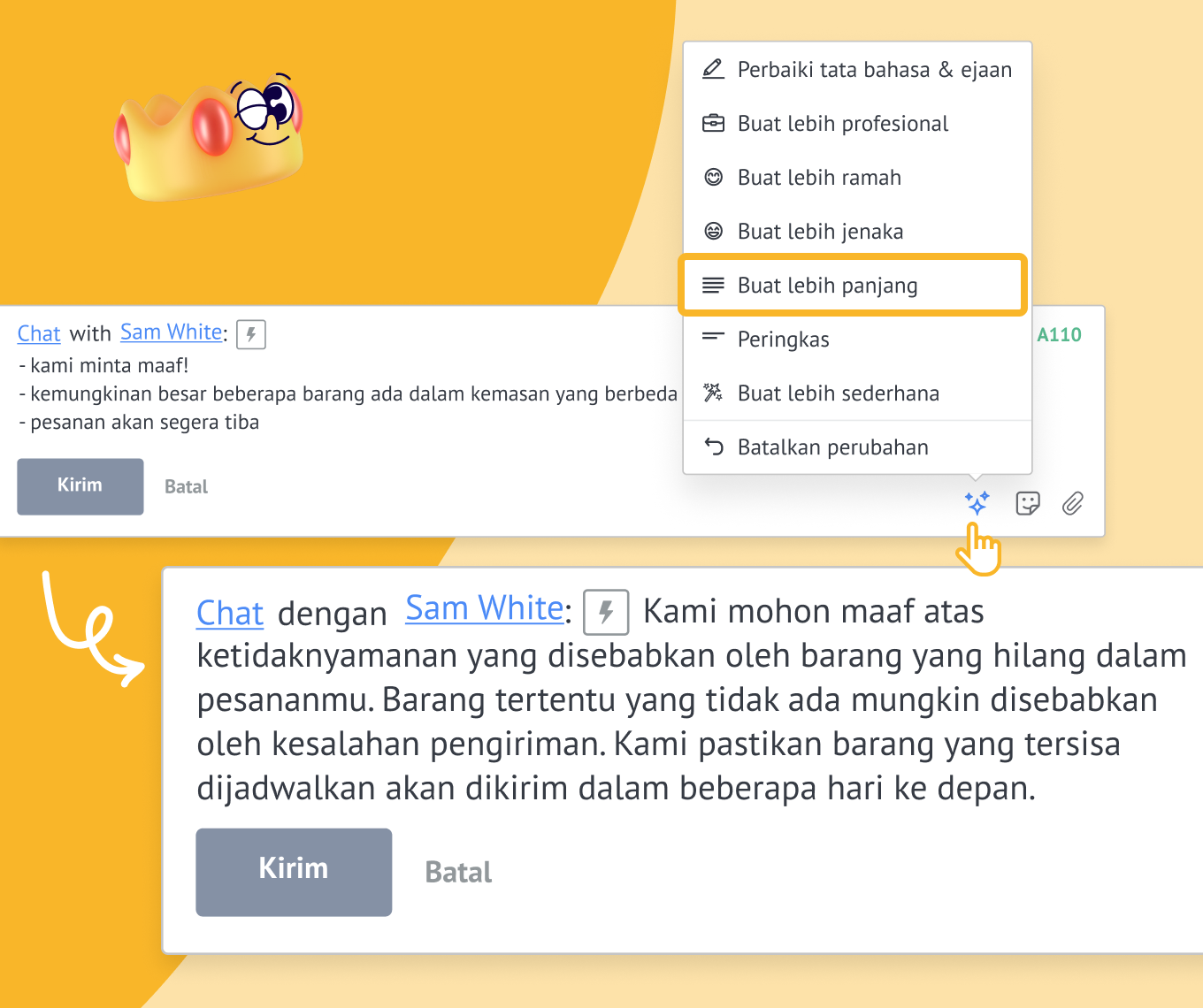 Lupakan sekadar spell-check biasa. Kommo AI bantu kamu menyempurnakan tone, memperpendek atau memperpanjang teks, bahkan meniru gaya komunikasi unik brand kamu. Cukup buat draft pesan, pilih preferensi, dan biarkan Kommo poles hingga sempurna!