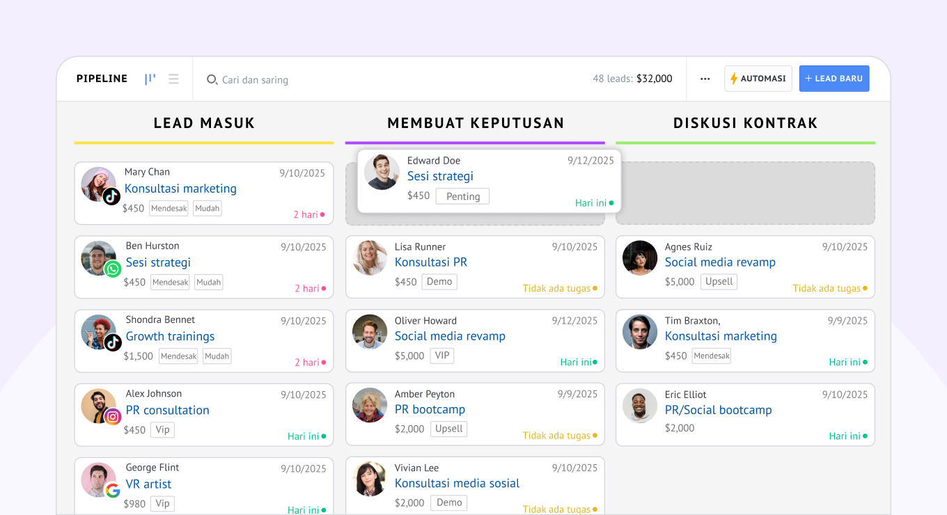 Entah kamu menjalankan satu funnel atau lima puluh, leads kamu bergerak otomatis melalui pipeline dari tahap dihubungi hingga closed!