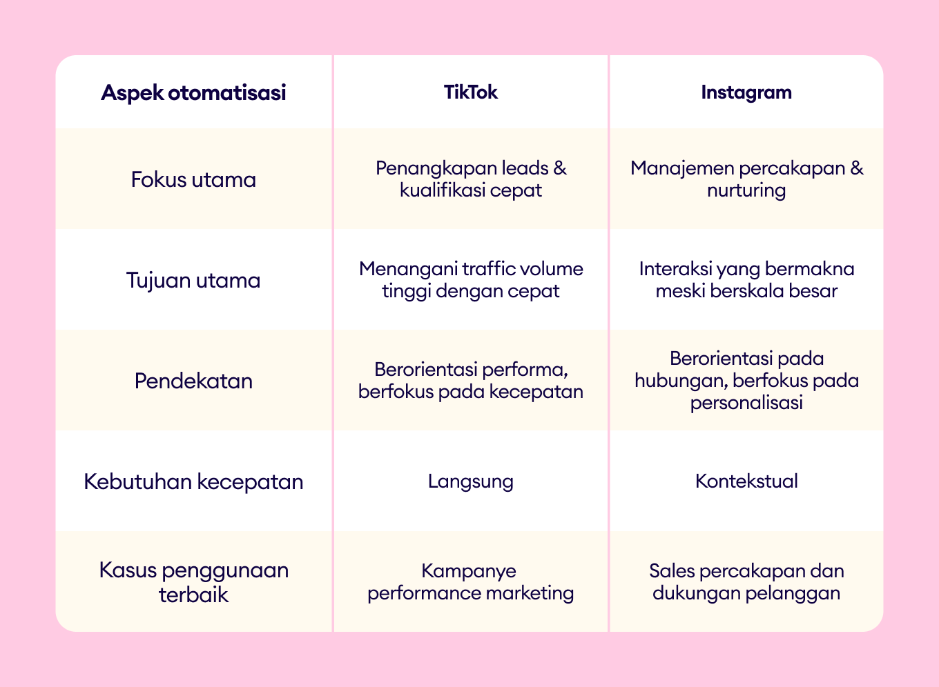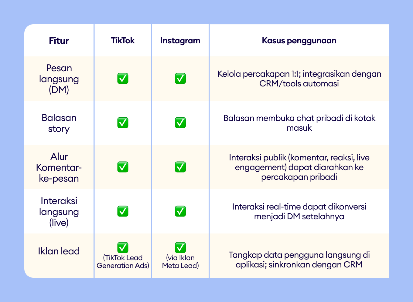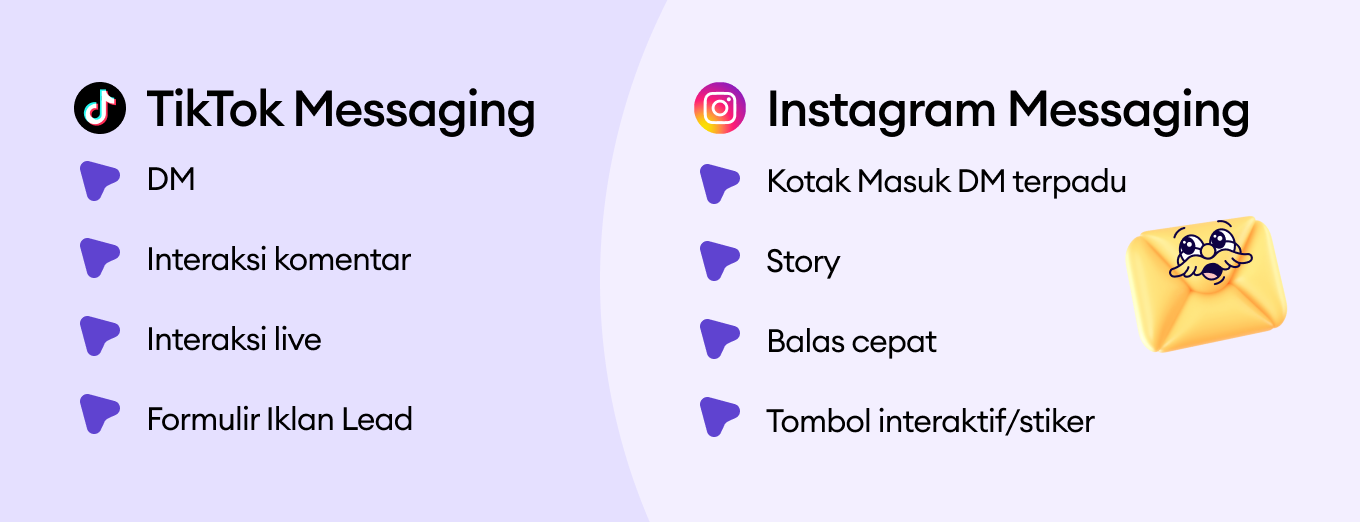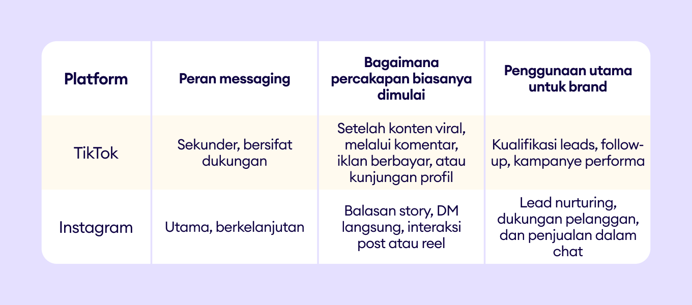 Perbandingan ini menunjukkan bahwa TikTok dan Instagram bukan hanya tentang format konten yang berbeda; keduanya mendukung tahap yang berbeda dalam customer journey, yang membentuk bagaimana brand seharusnya mendekati messaging, automasi, dan engagement.