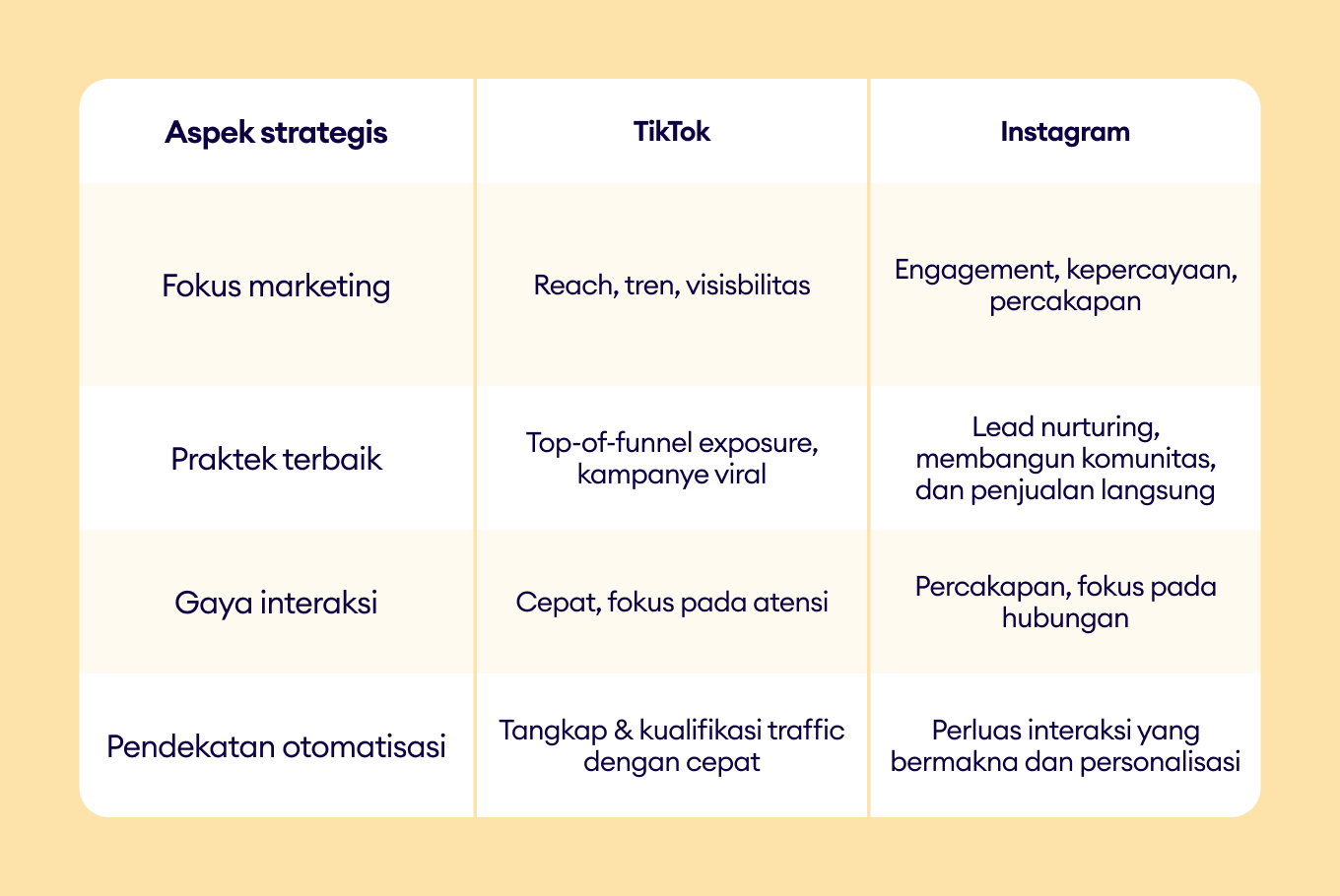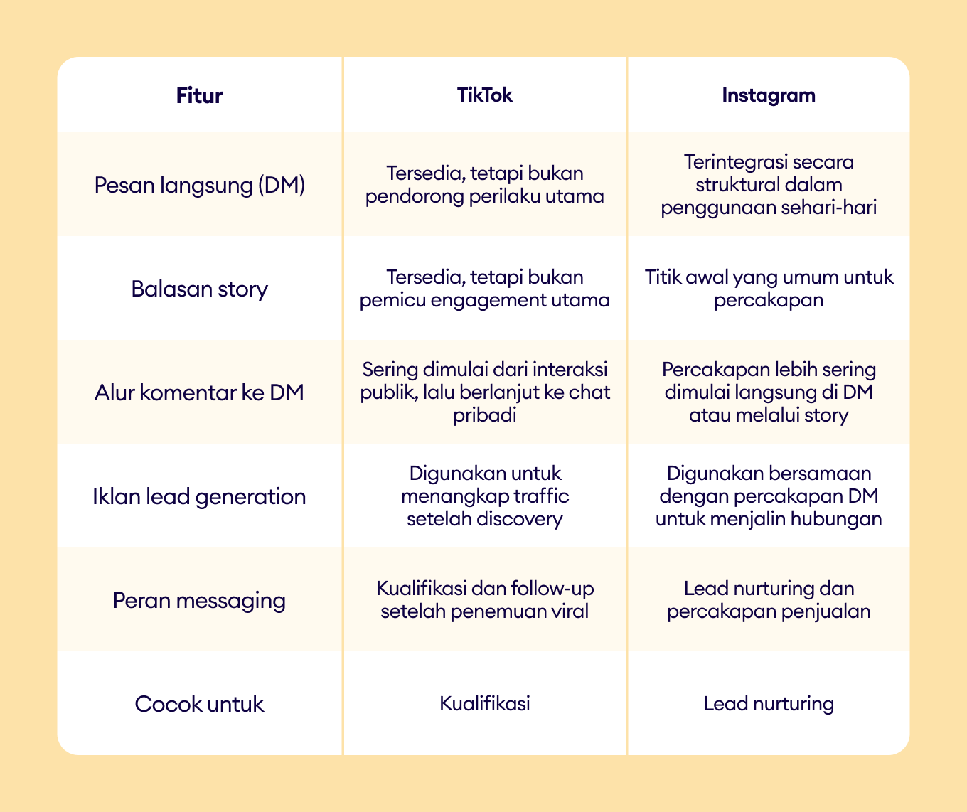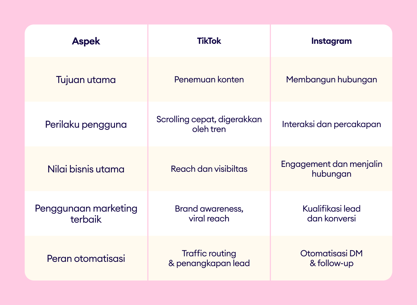 Perbandingan ini menunjukkan bahwa TikTok dan Instagram bukan hanya tentang format konten yang berbeda; keduanya mendukung tahap yang berbeda dalam customer journey, yang membentuk bagaimana brand seharusnya mendekati messaging, automasi, dan engagement.