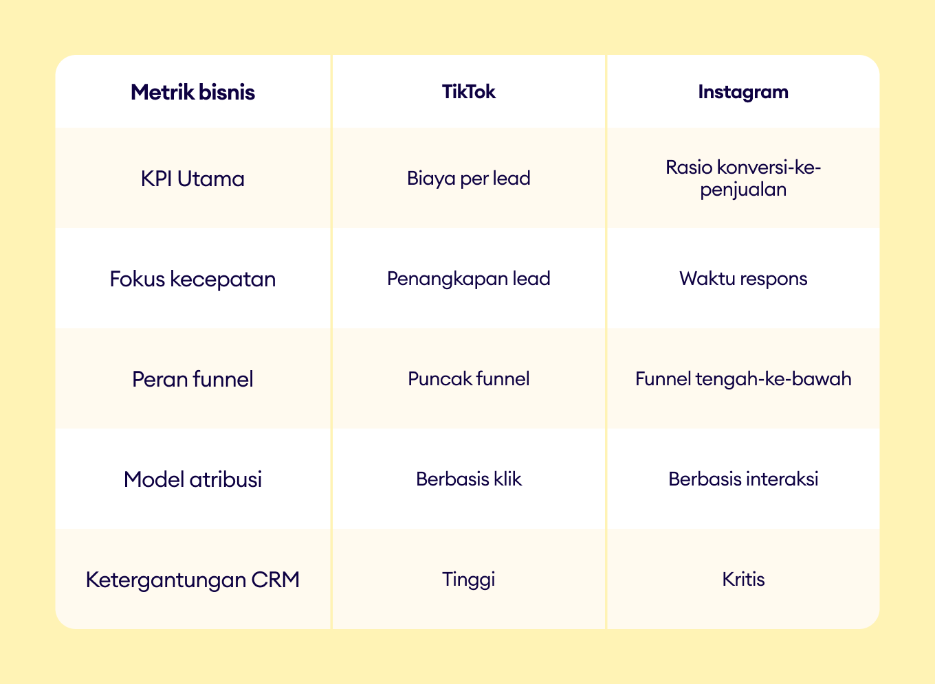 TikTok mendorong discovery dan menghasilkan volume leads. Instagram mengubah perhatian tersebut menjadi percakapan, kepercayaan, dan penjualan. Keduanya memiliki peran yang berbeda — tetapi saling melengkapi — dalam strategi pertumbuhan kamu.