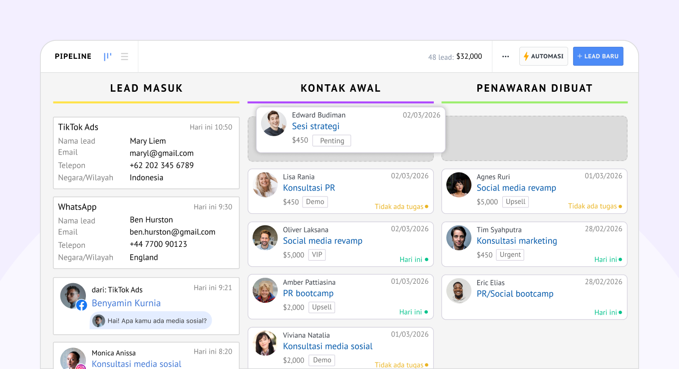 Setiap lead dan percakapan dilacak melalui satu pipeline visual.