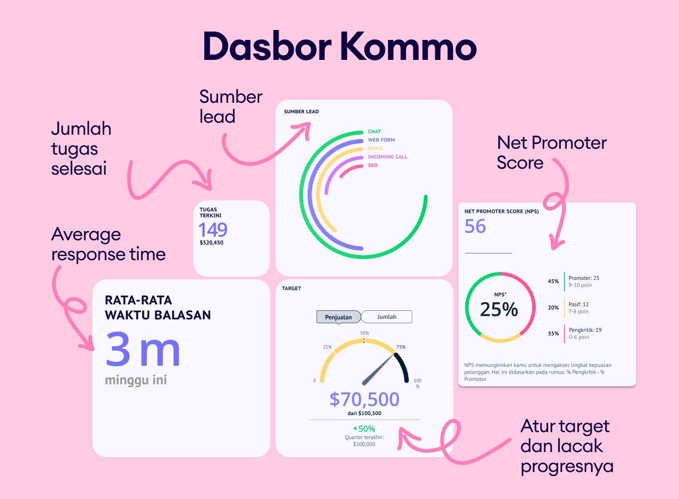Kommo menghadirkan setiap percakapan ke dalam satu dasbor terpusat, sehingga kamu tidak perlu berpindah-pindah aplikasi atau kehilangan konteks, dengan fitur seperti: