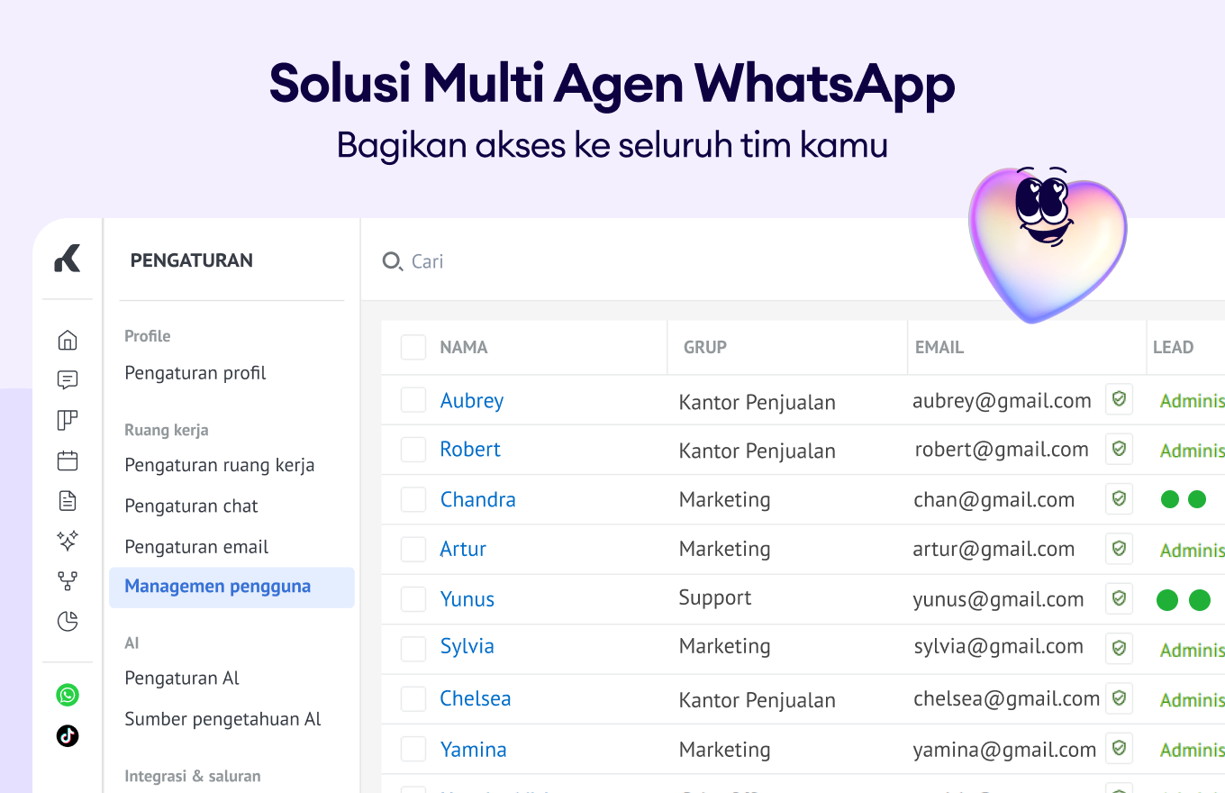 Mulailah menggunakan WhatsApp Business dengan banyak pengguna untuk pengalaman terbaik bagi banyak pengguna. Berkat fitur ini, kamu akan memaksimalkan komunikasi klien di seluruh WhatsApp dan platform perpesanan lainnya dan membuka jalan kamu menuju kesuksesan! 🤓