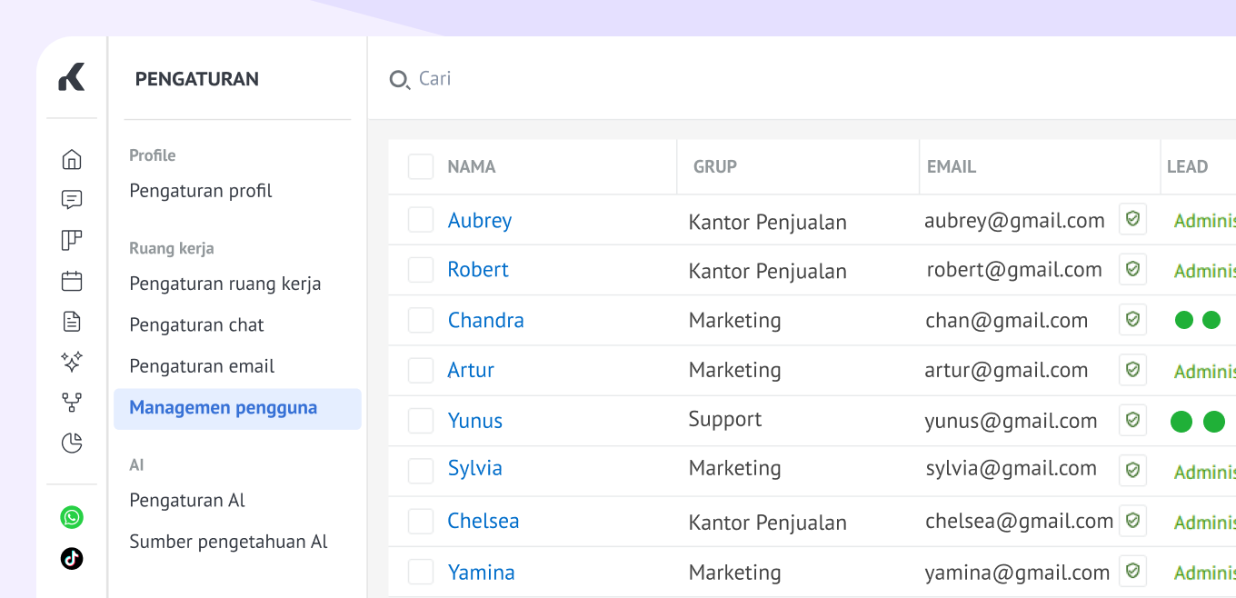 Kamu bisa nyesuaiin izin pengguna untuk mengelola data seperti lead, pelanggan, kontak, perusahaan, dan daftar tugas.