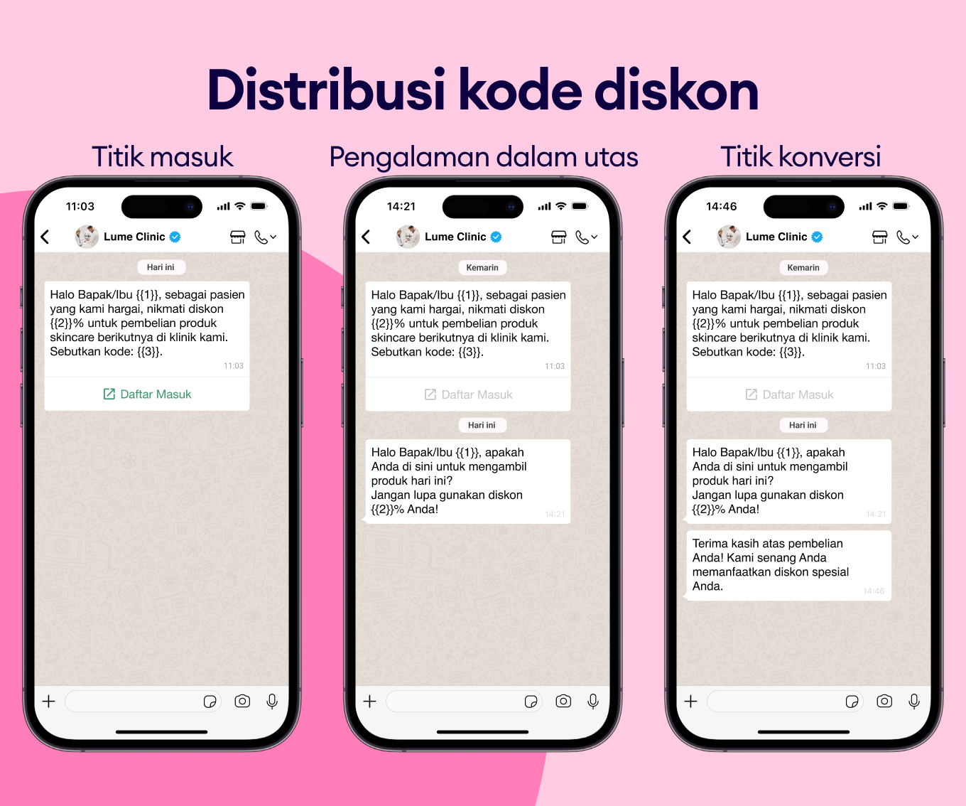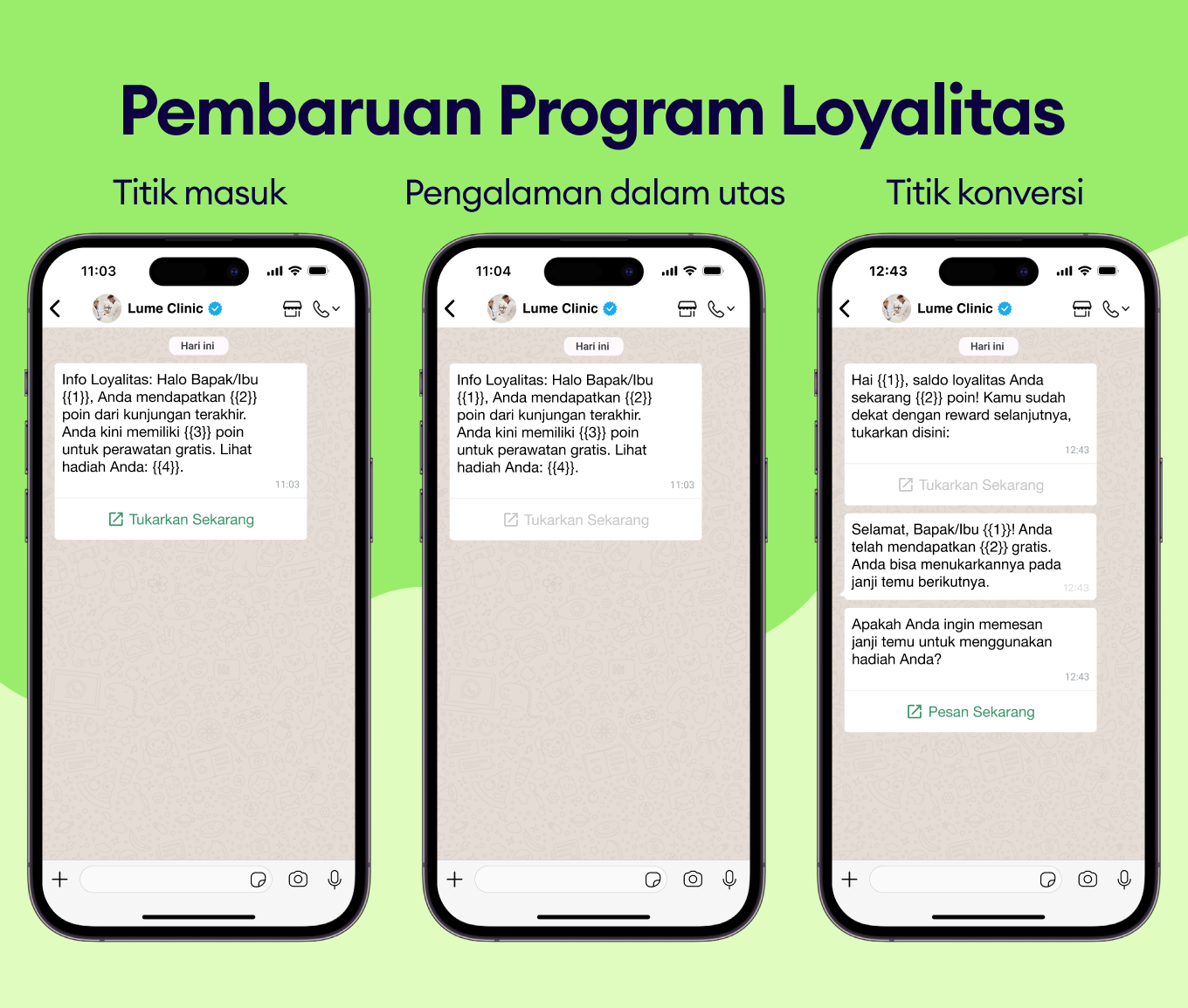 Perkuat hubungan dengan pasien melalui update personal tentang benefit program, reward yang akan datang, dan lainnya menggunakan template pesan WhatsApp.