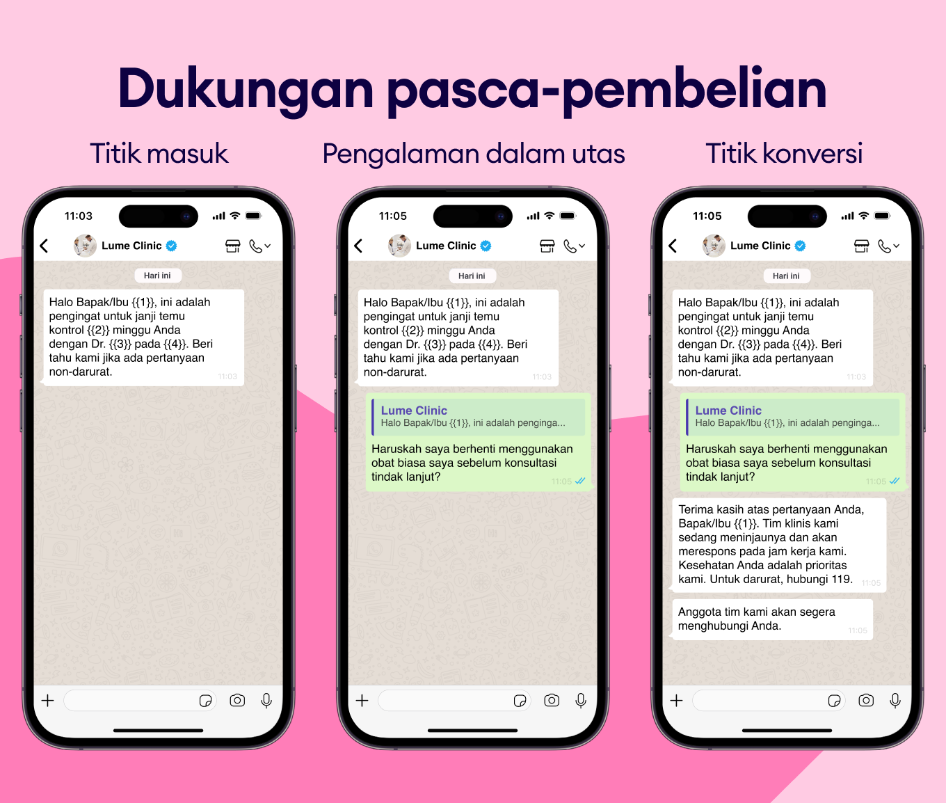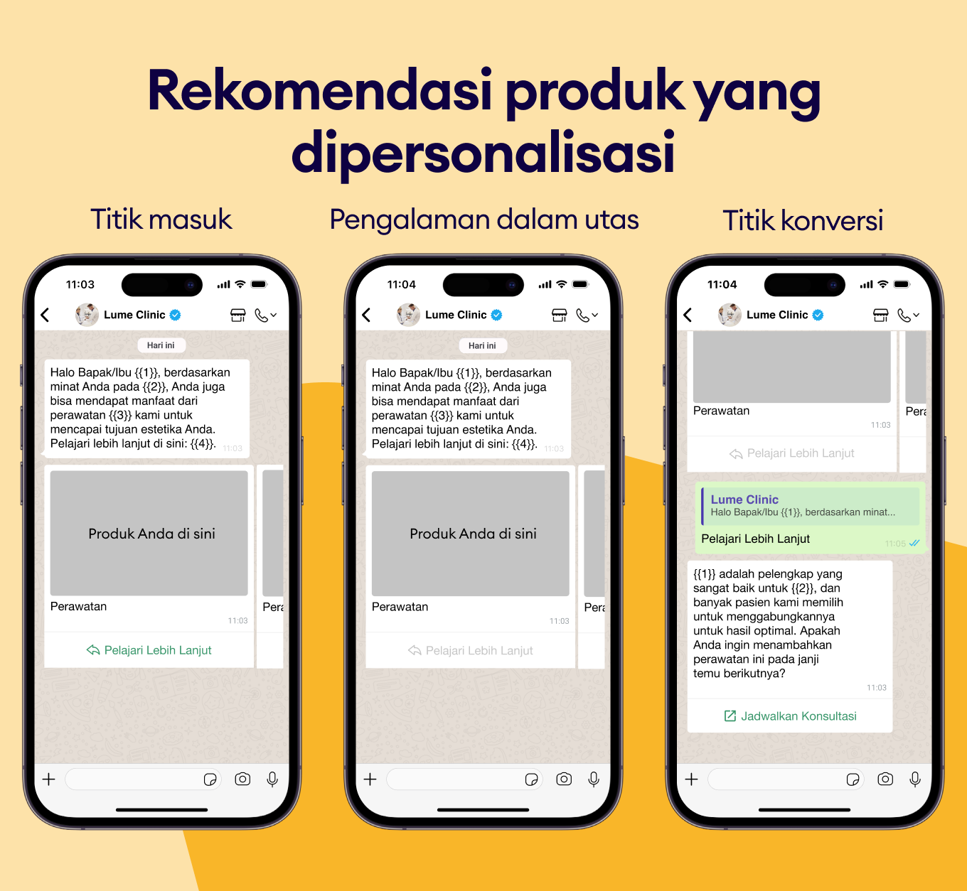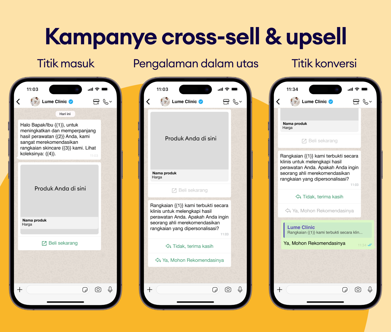 Gunakan pesan WhatsApp untuk merekomendasikan prosedur atau check-up yang relevan dan meningkatkan nilai pembelian.