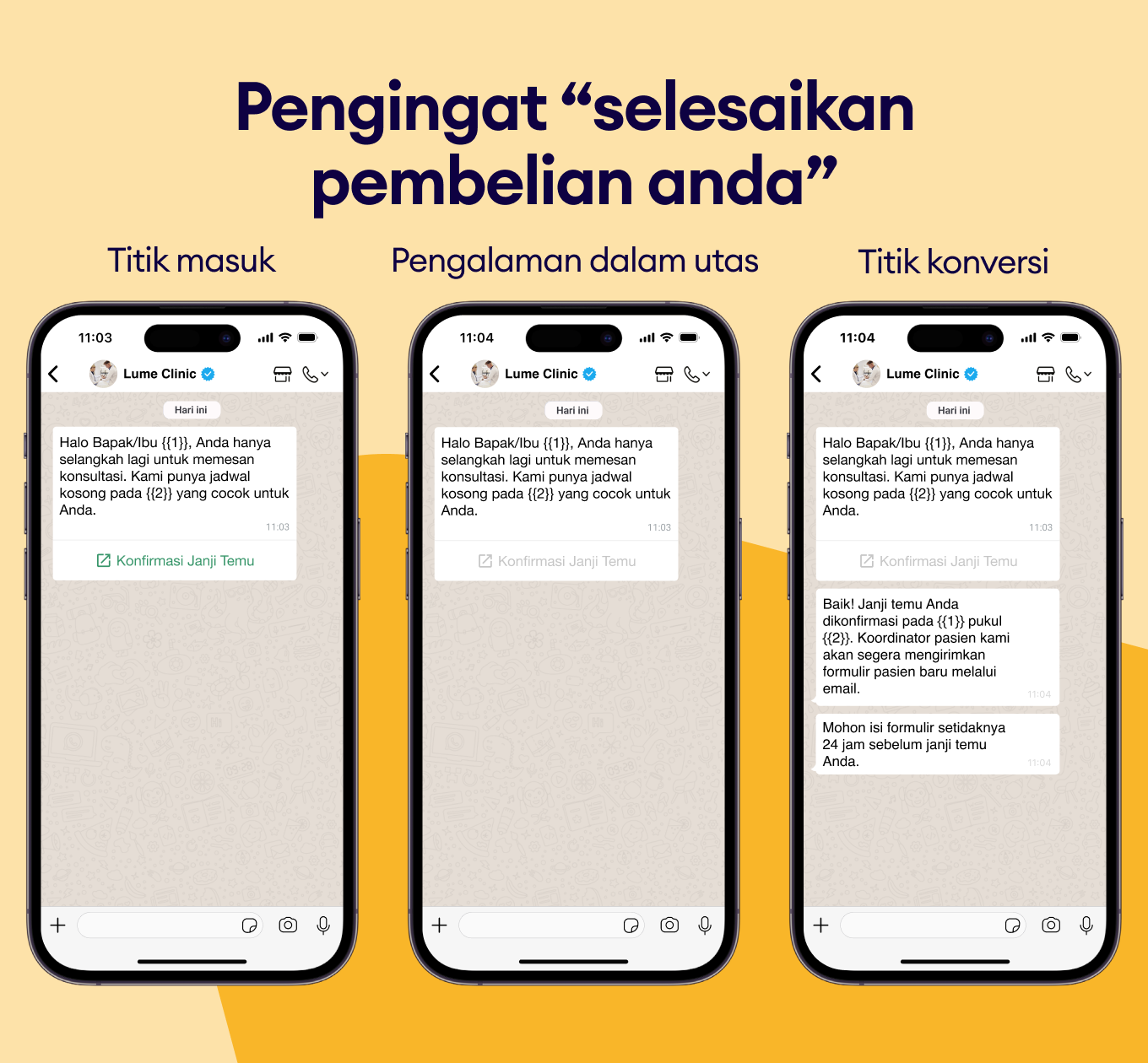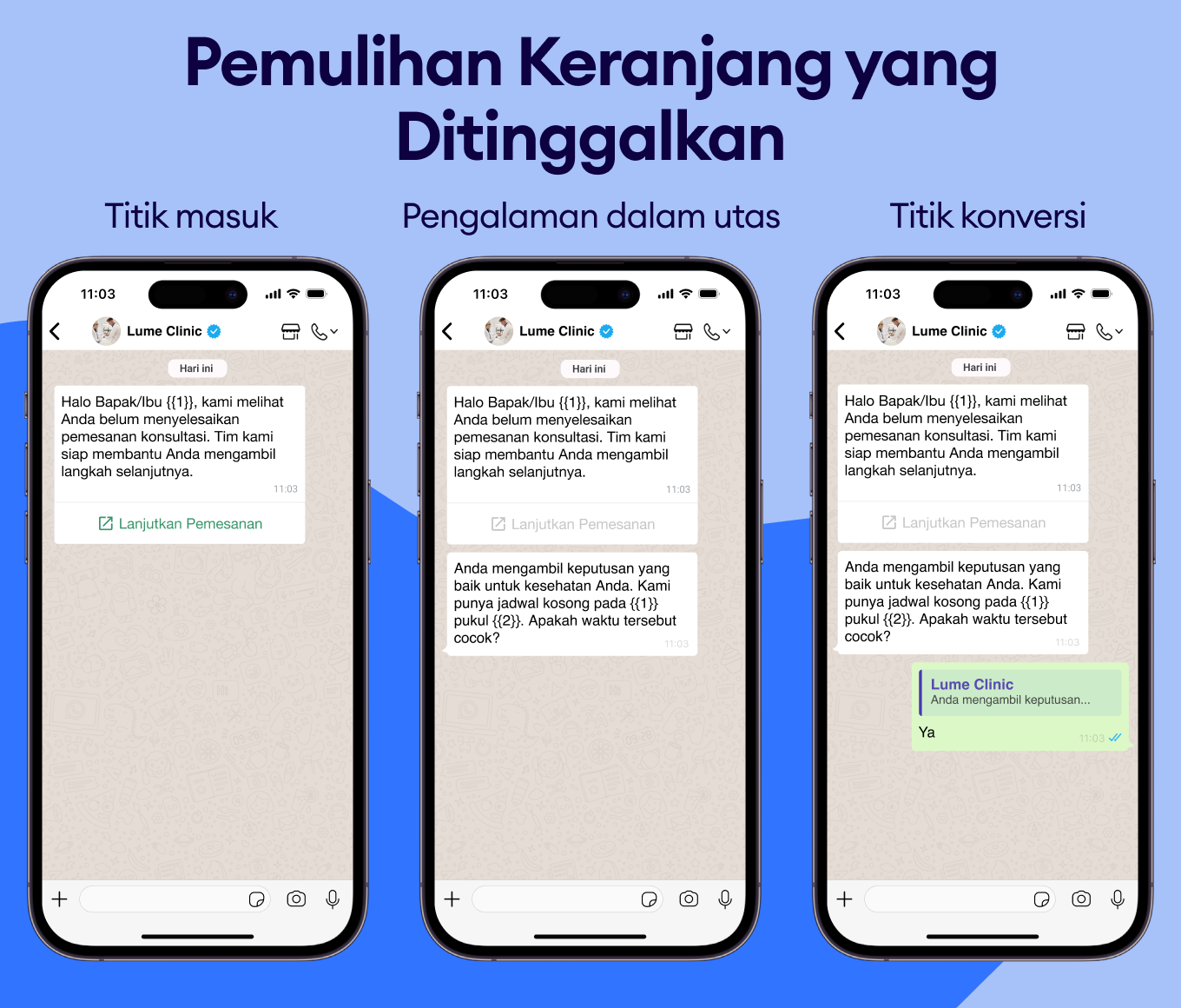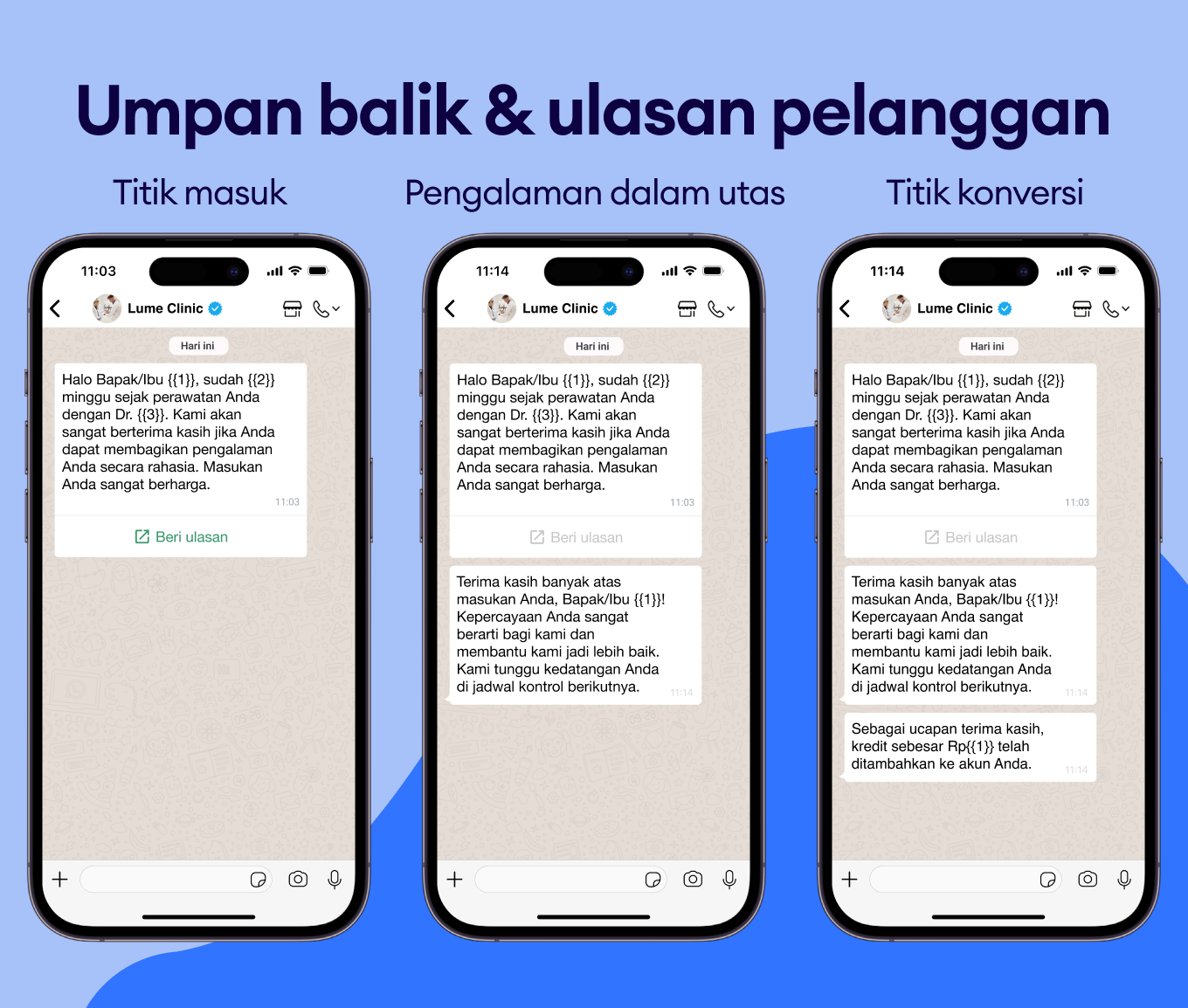 Gunakan pesan WhatsApp untuk merekomendasikan prosedur atau check-up yang relevan dan meningkatkan nilai pembelian.