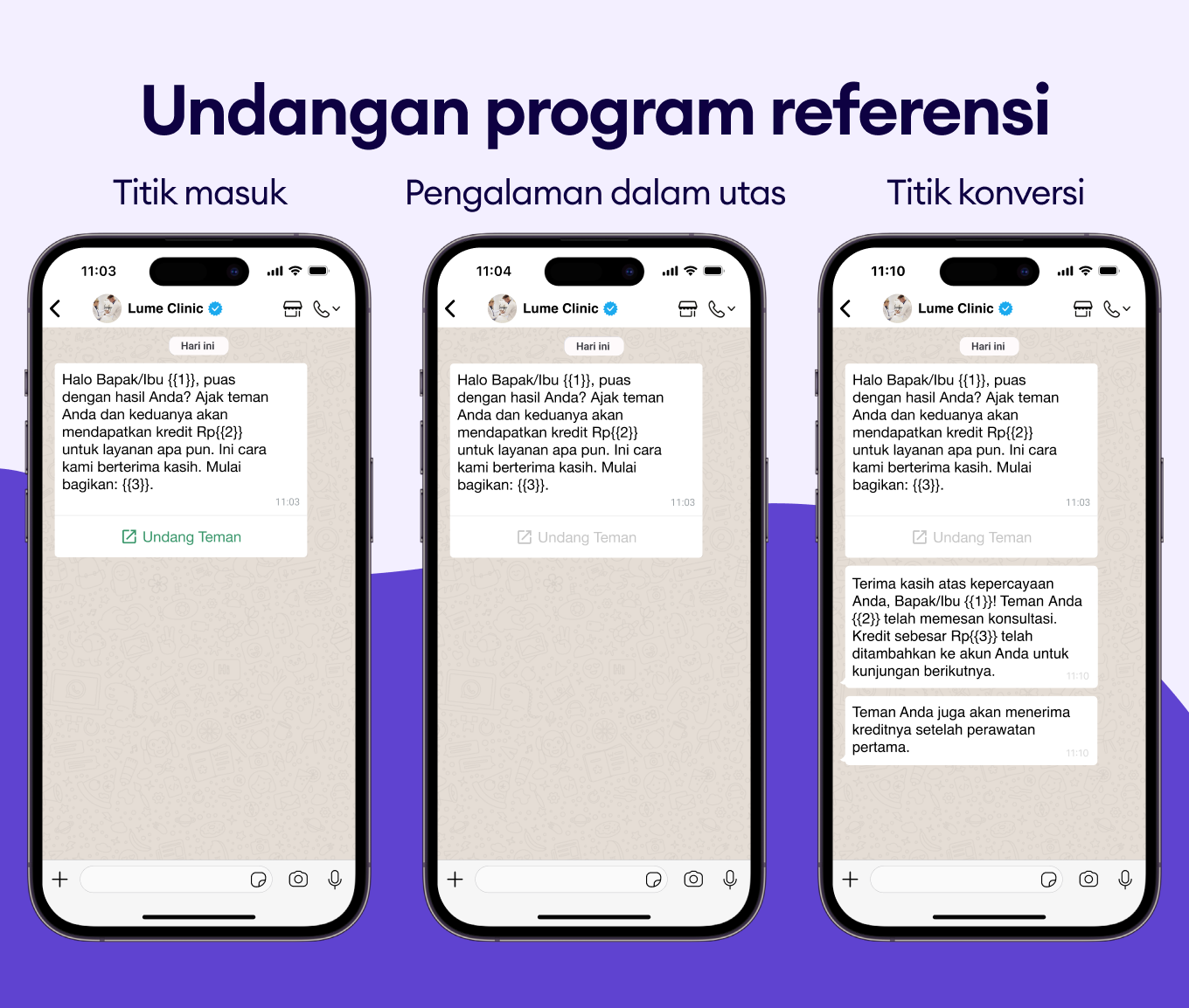 Ajak pasien untuk berbagi dan mendapatkan reward melalui undangan referral via WhatsApp.