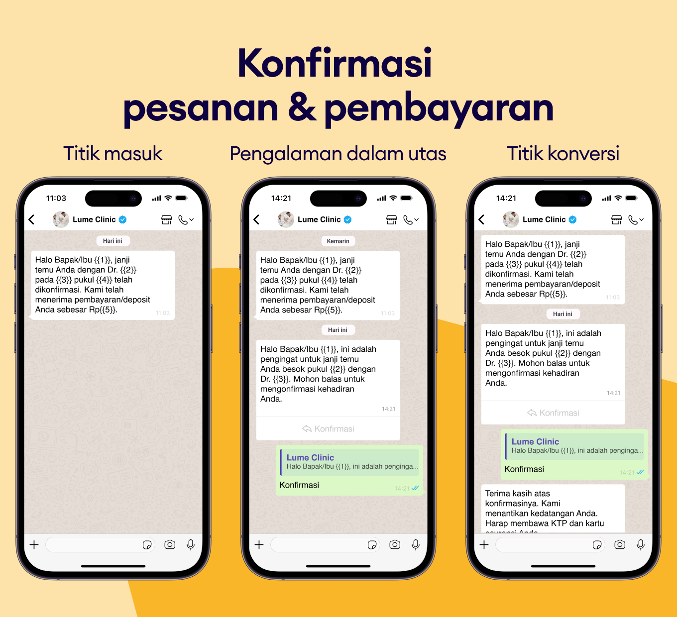 Konfirmasi booking secara instan, akui penerimaan pembayaran, dan jaga pasien tetap terinformasi dengan template pesan WhatsApp otomatis.