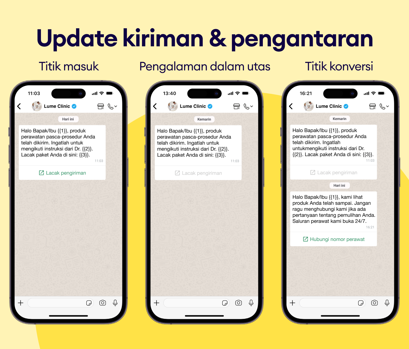Informasikan status paket atau layanan kepada pasien melalui update pesan template WhatsApp otomatis.
