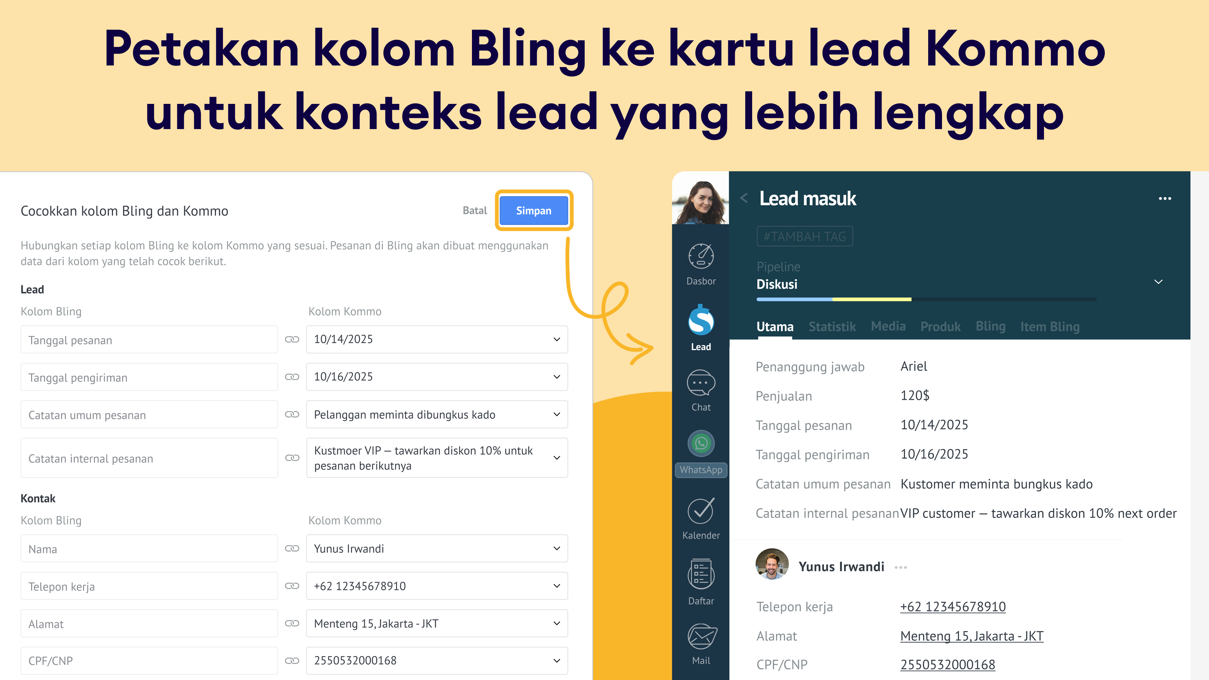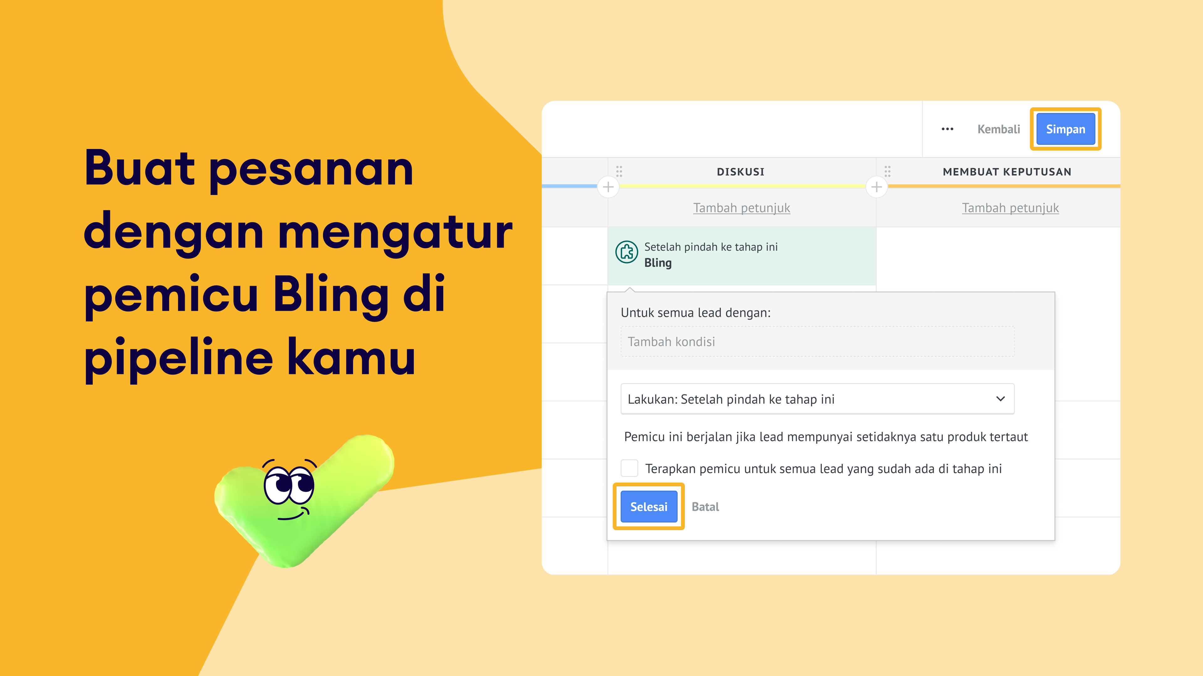 Otomatisasi berbasis pemicu: Konfigurasikan pemicu Bling di pipeline kamu agar pesanan otomatis dibuat ketika lead mencapai tahap tertentu.