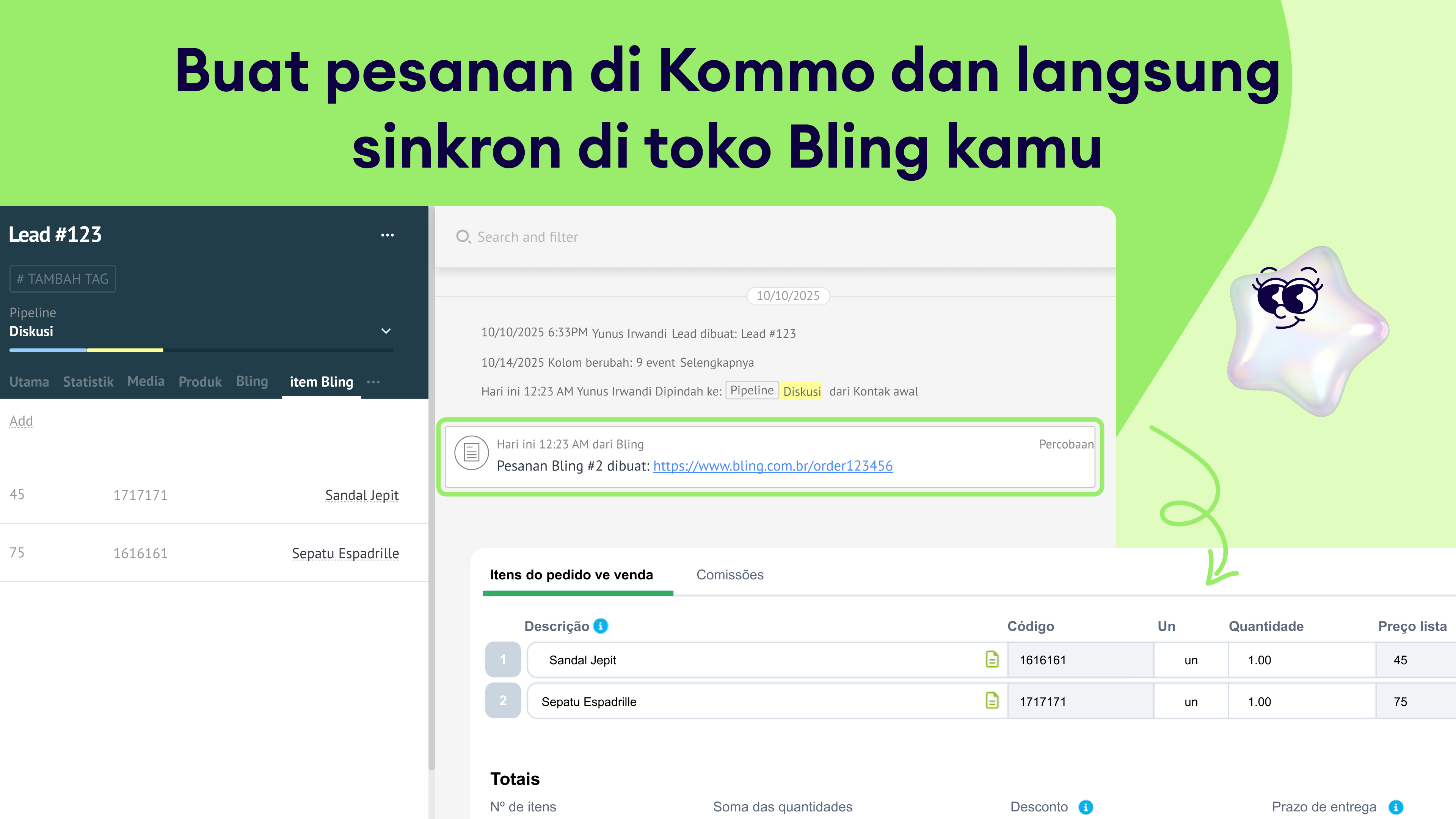 Pembuatan pesanan manual: Buat pesanan di Bling dengan cepat dari kartu lead yang sudah terisi lengkap, termasuk daftar produk dan detail pesanan.