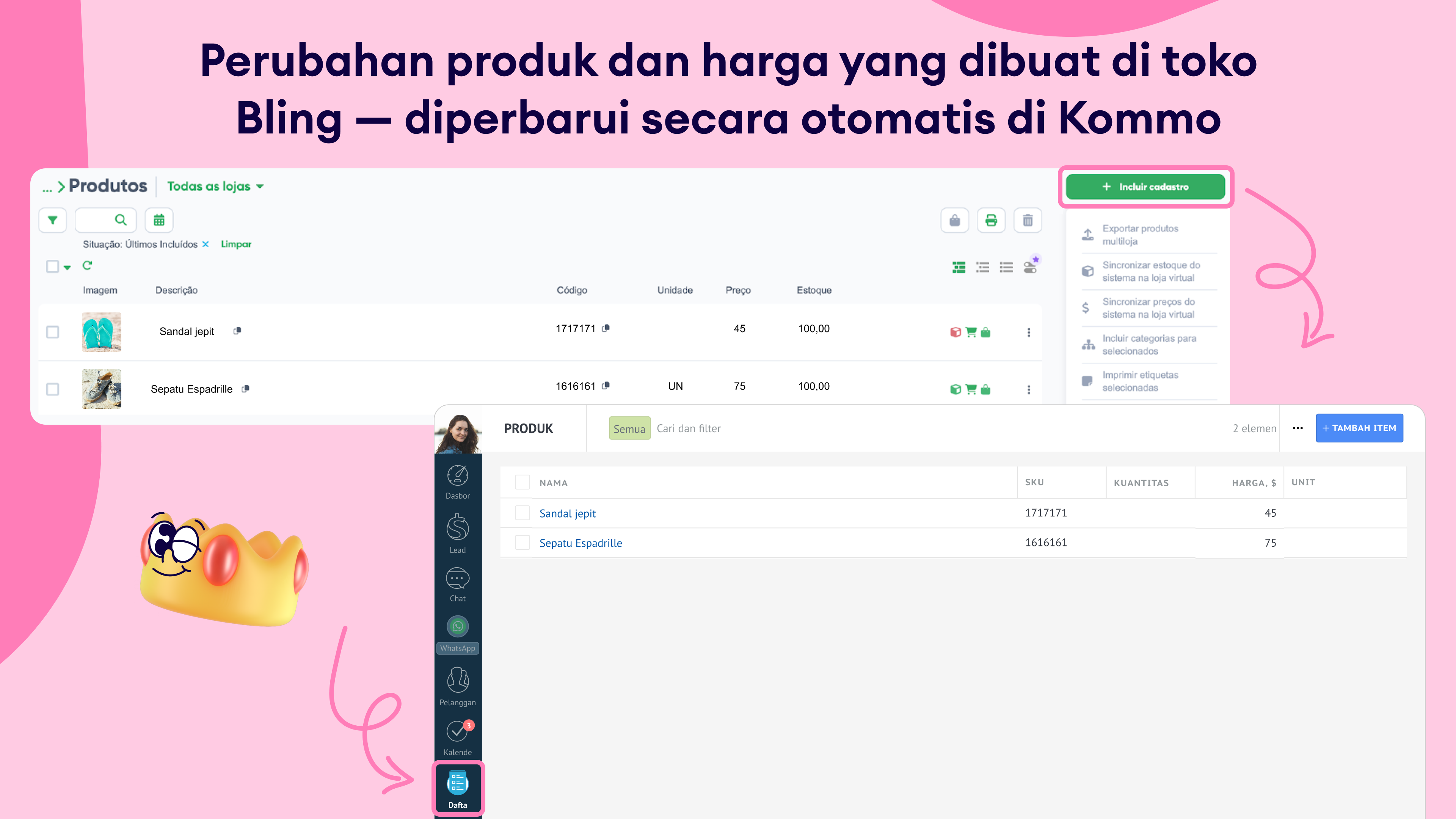 Impor produk otomatis: Sinkronkan seluruh katalog produk Bling kamu langsung ke Kommo untuk akses mudah di kartu lead.