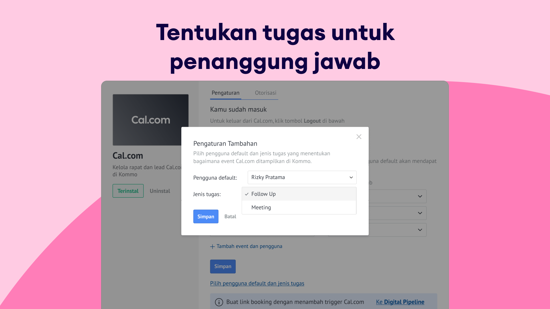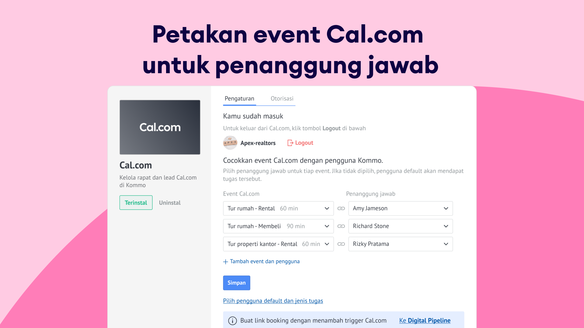 Pemetaan event ke pengguna: Tetapkan event Cal.com tertentu ke pengguna Kommo agar setiap janji temu memiliki penanggung jawab yang jelas.