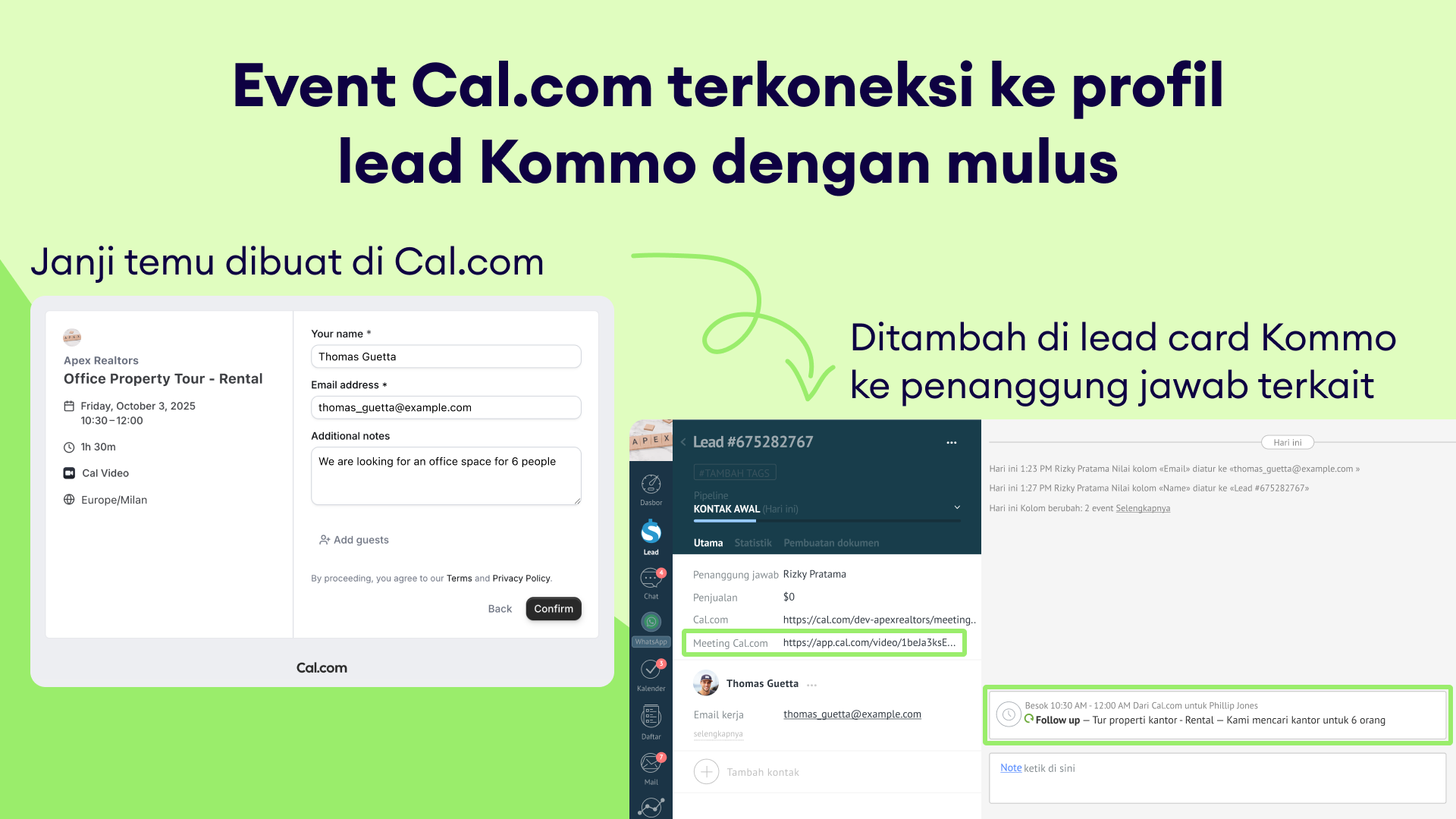 Pembuatan tugas instan: Setiap pemesanan di Cal.com akan otomatis membuat tugas (Follow-Up atau Meeting) di Kommo, lengkap dengan detail klien dan informasi pertemuan.