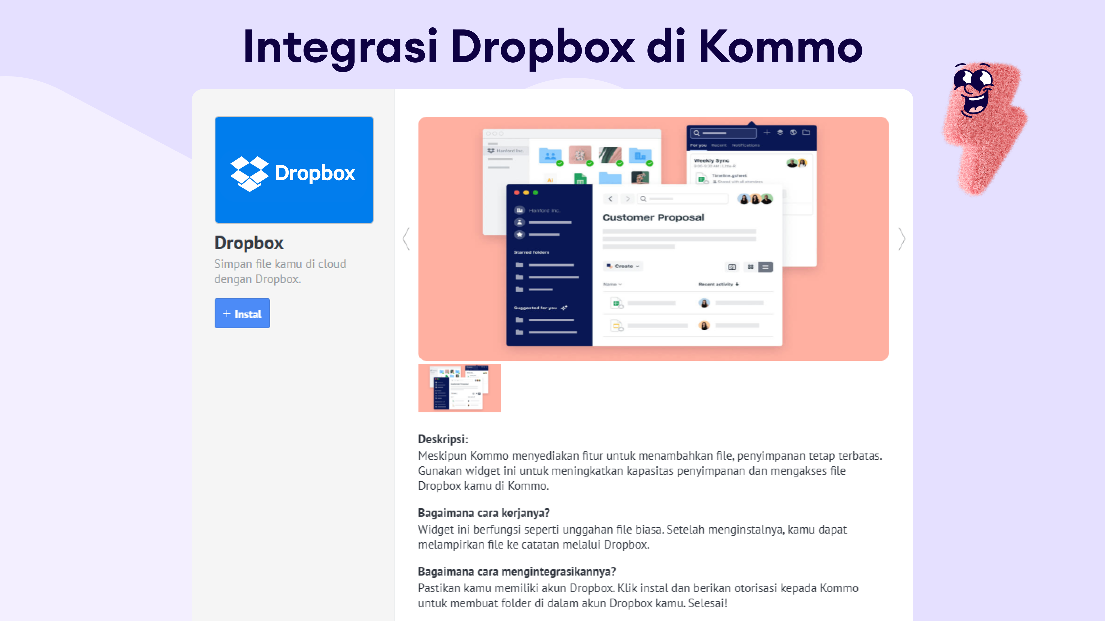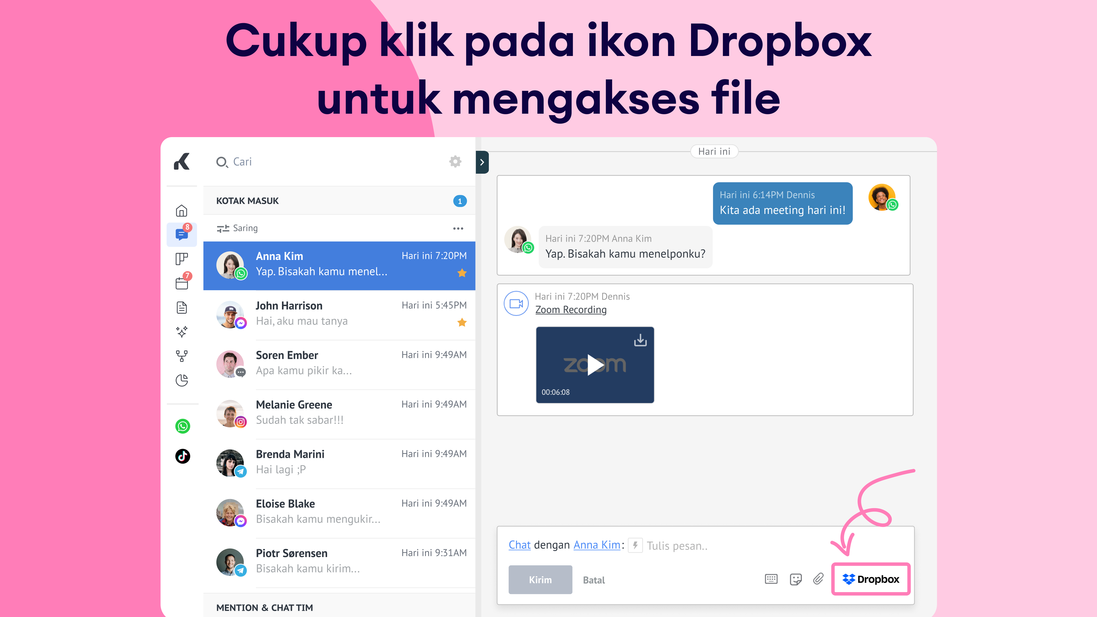 Akses file: Buka dan lihat file Dropbox langsung di Kommo, membuat workflow lebih efisien tanpa perlu berpindah aplikasi.