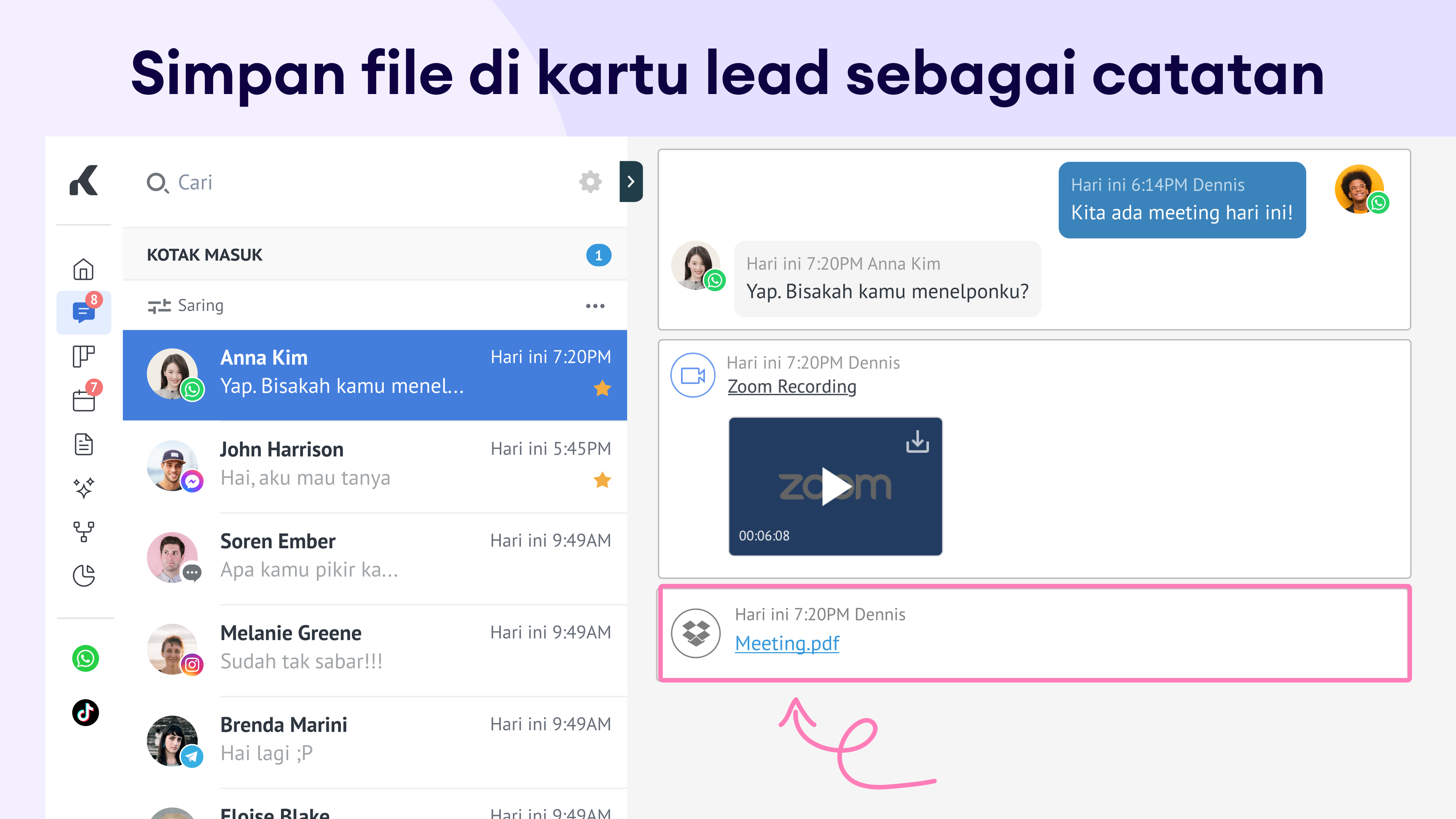 Lampirkan file ke kartu leads: Mudah melampirkan file dari Dropbox langsung ke catatan kartu leads, sehingga semua dokumen penting tersimpan di satu tempat.