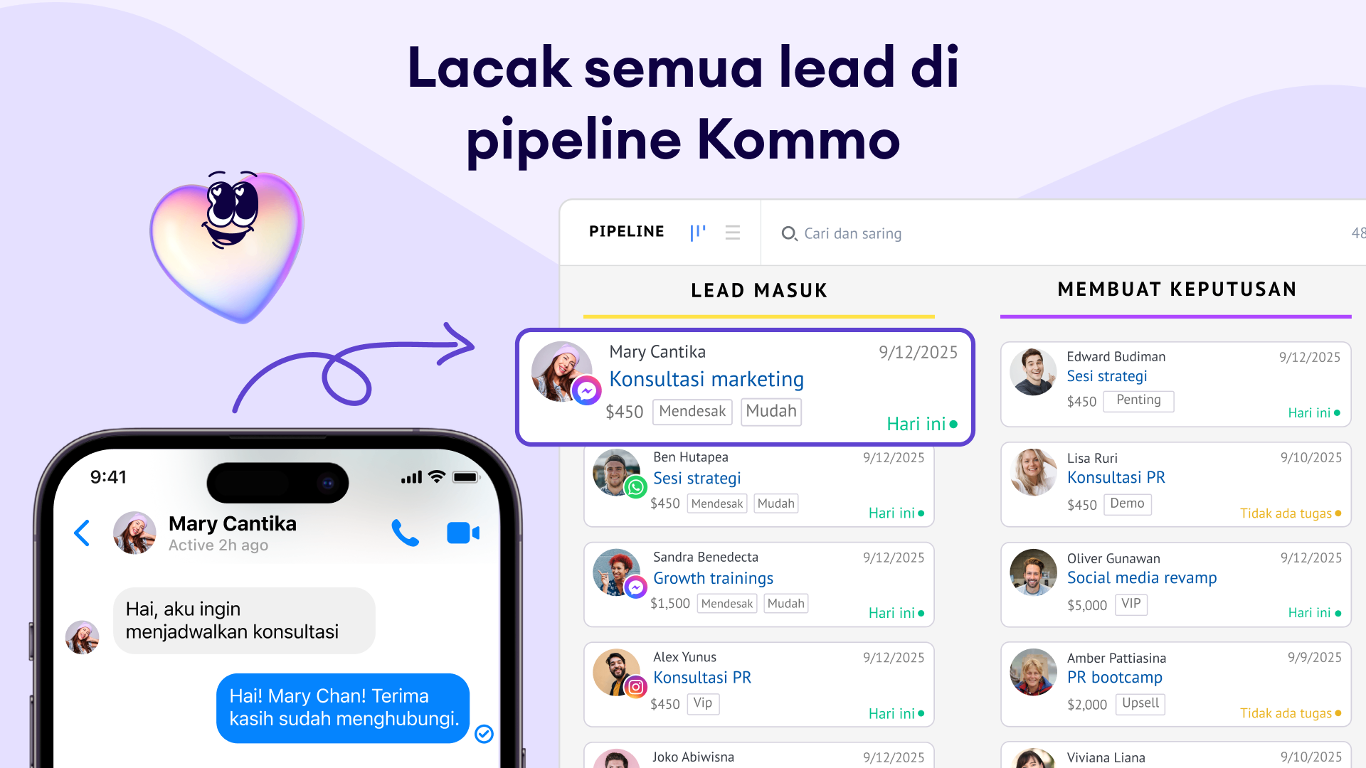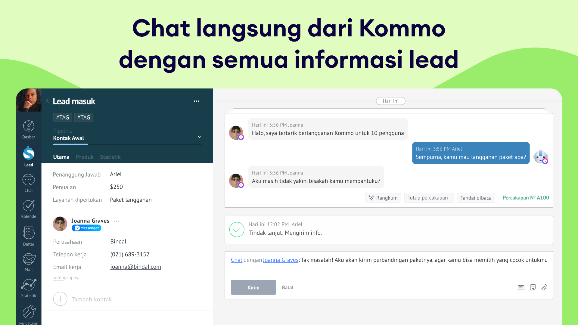 Pelacakan riwayat pesan: Semua percakapan Messenger tercatat di feed lead, jadi kamu selalu punya konteks lengkap.