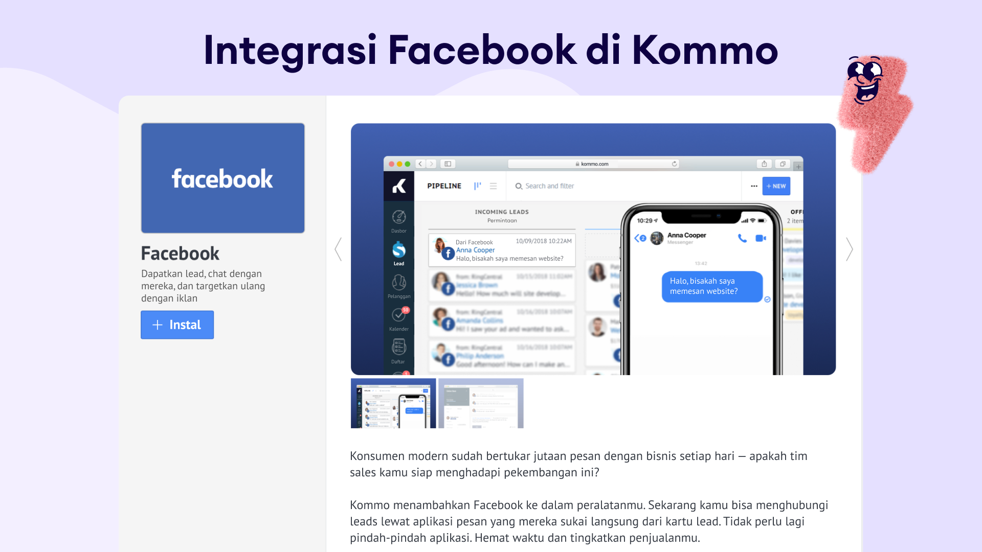Kunjungi panduan setup kami untuk belajar lebih banyak cara menggunakan Facebook Messenger di Kommo.
