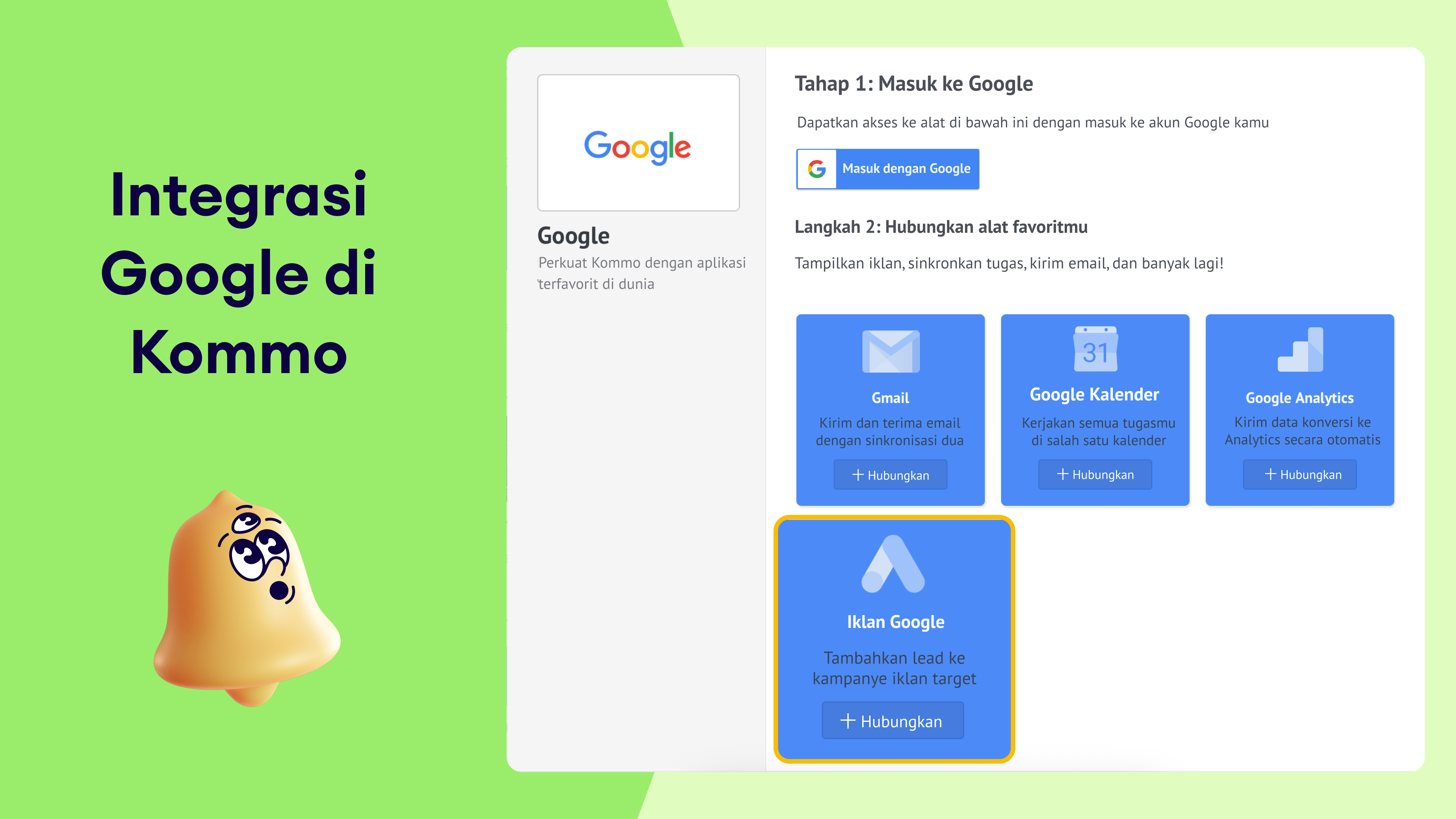 Untuk menghubungkan Google Ads ke Kommo, pastikan kamu memiliki akun Google Ads dengan izin menggunakan Customer Match, lalu ikuti langkah berikut: