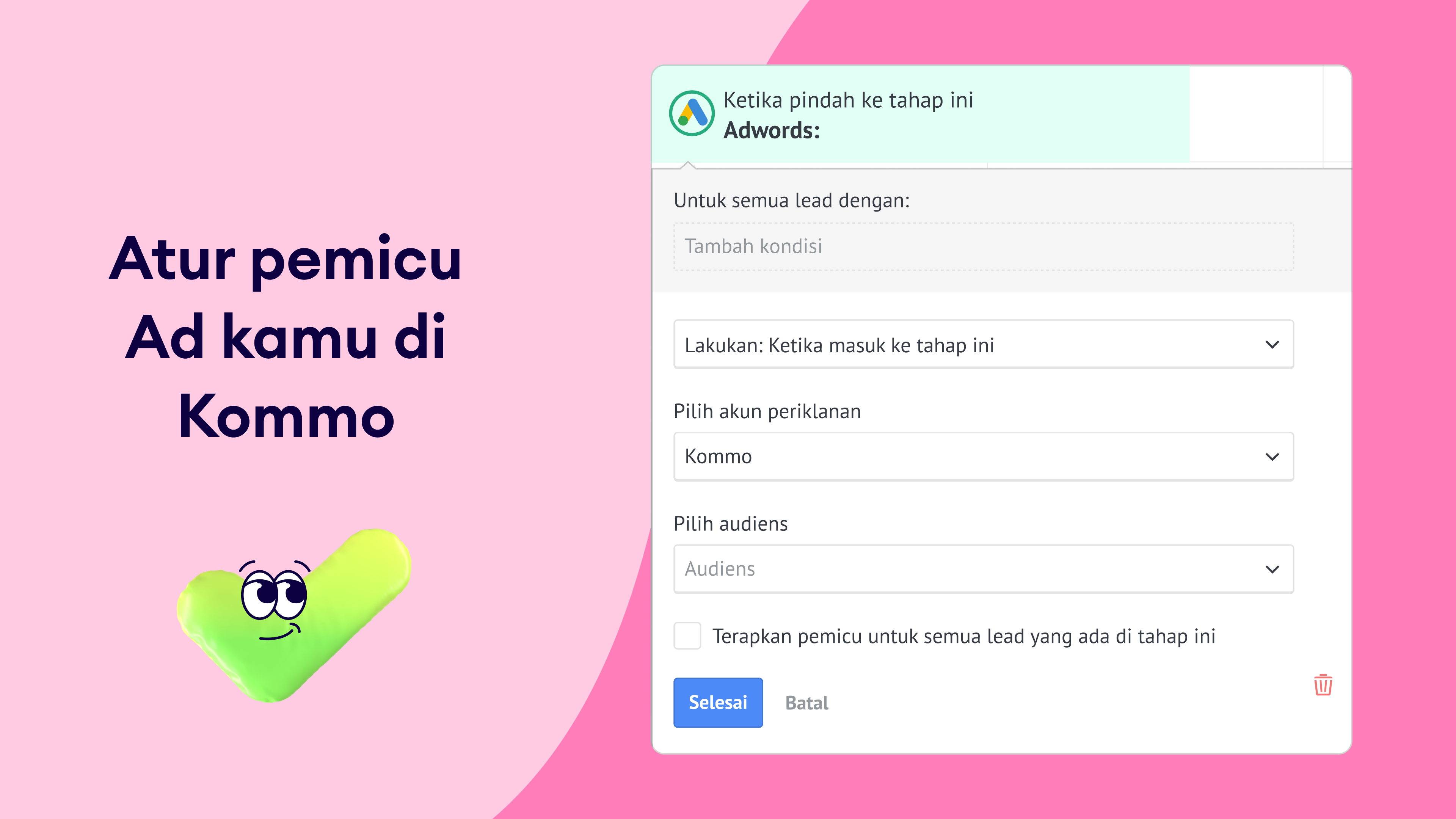 - Atur pengaturan pemicu, termasuk kondisi untuk menambahkan leads ke audiens dan campaign Google Ads yang akan digunakan.