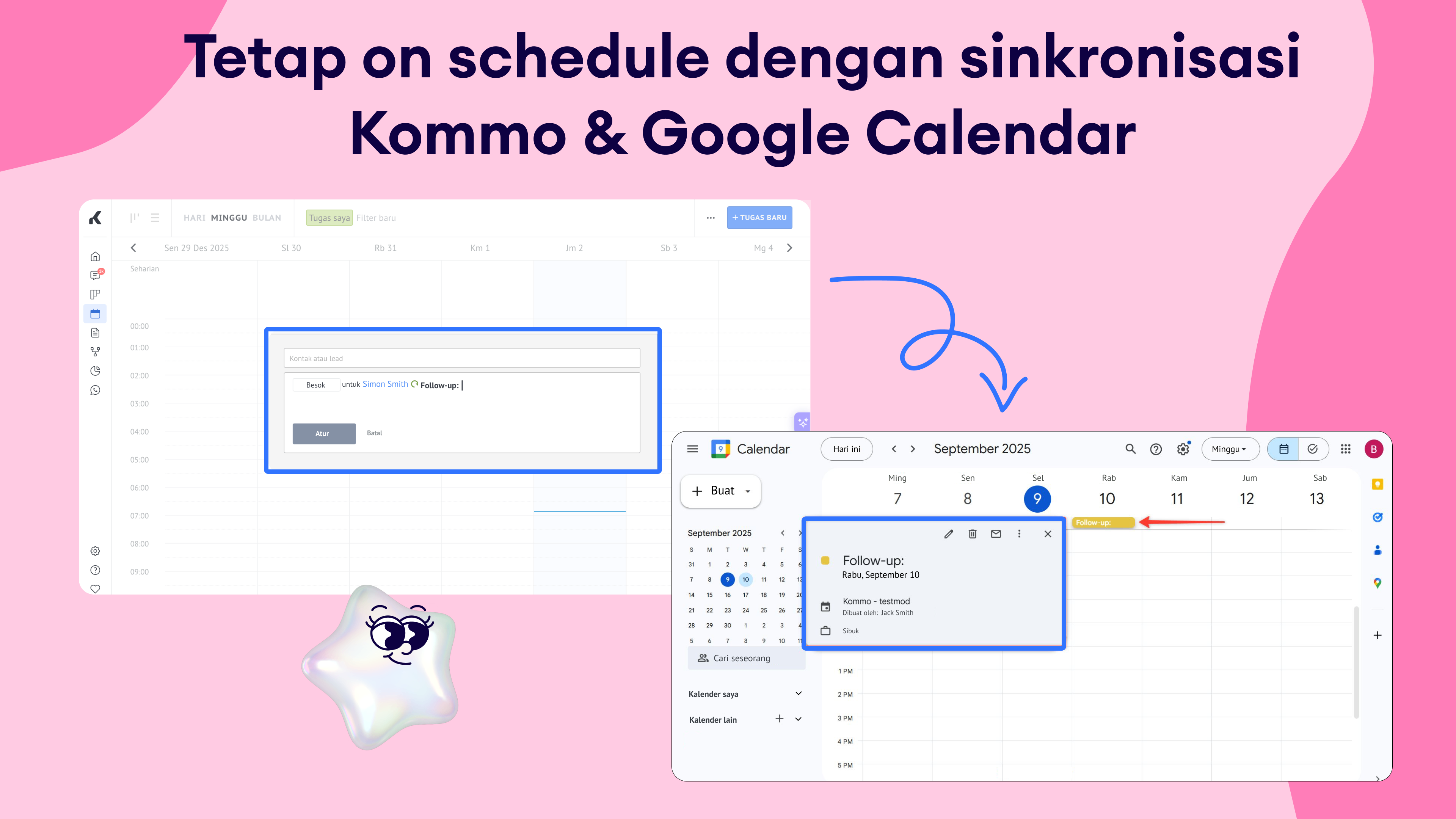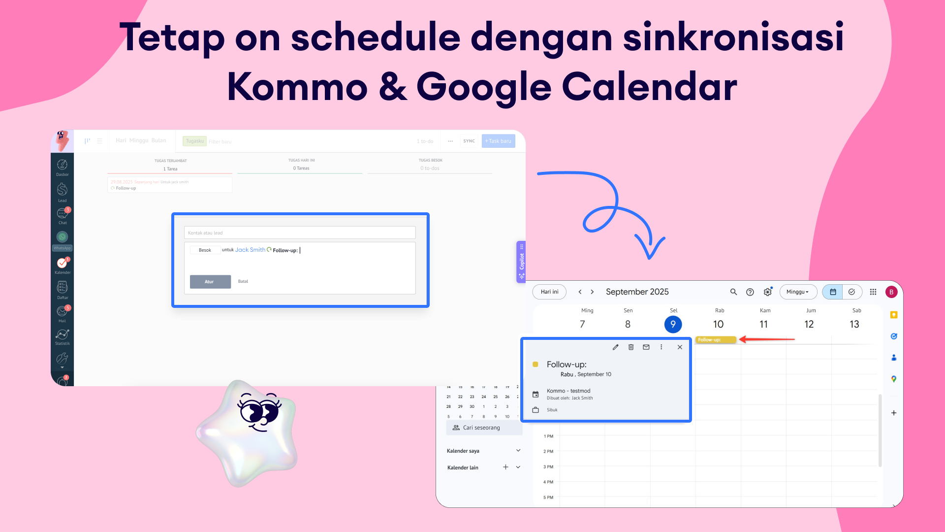 Sinkronisasi tugas & event dua arah: Buat atau update tugas di Kommo atau event di Google Calendar — keduanya akan selalu sinkron dengan sempurna.