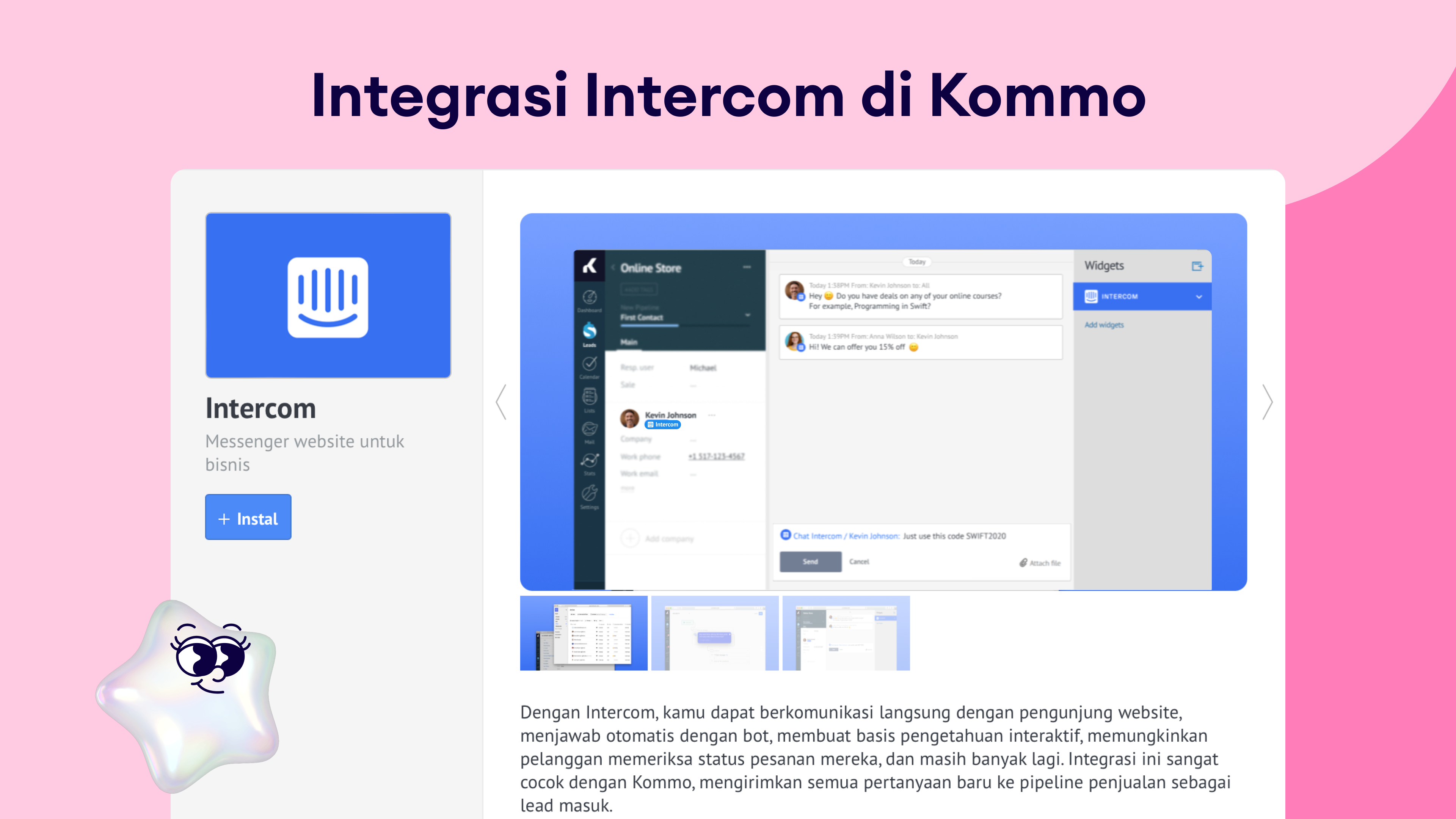 Di Kommo, buka Pengaturan > Integrasi > Cari Intercom lalu klik Instal.