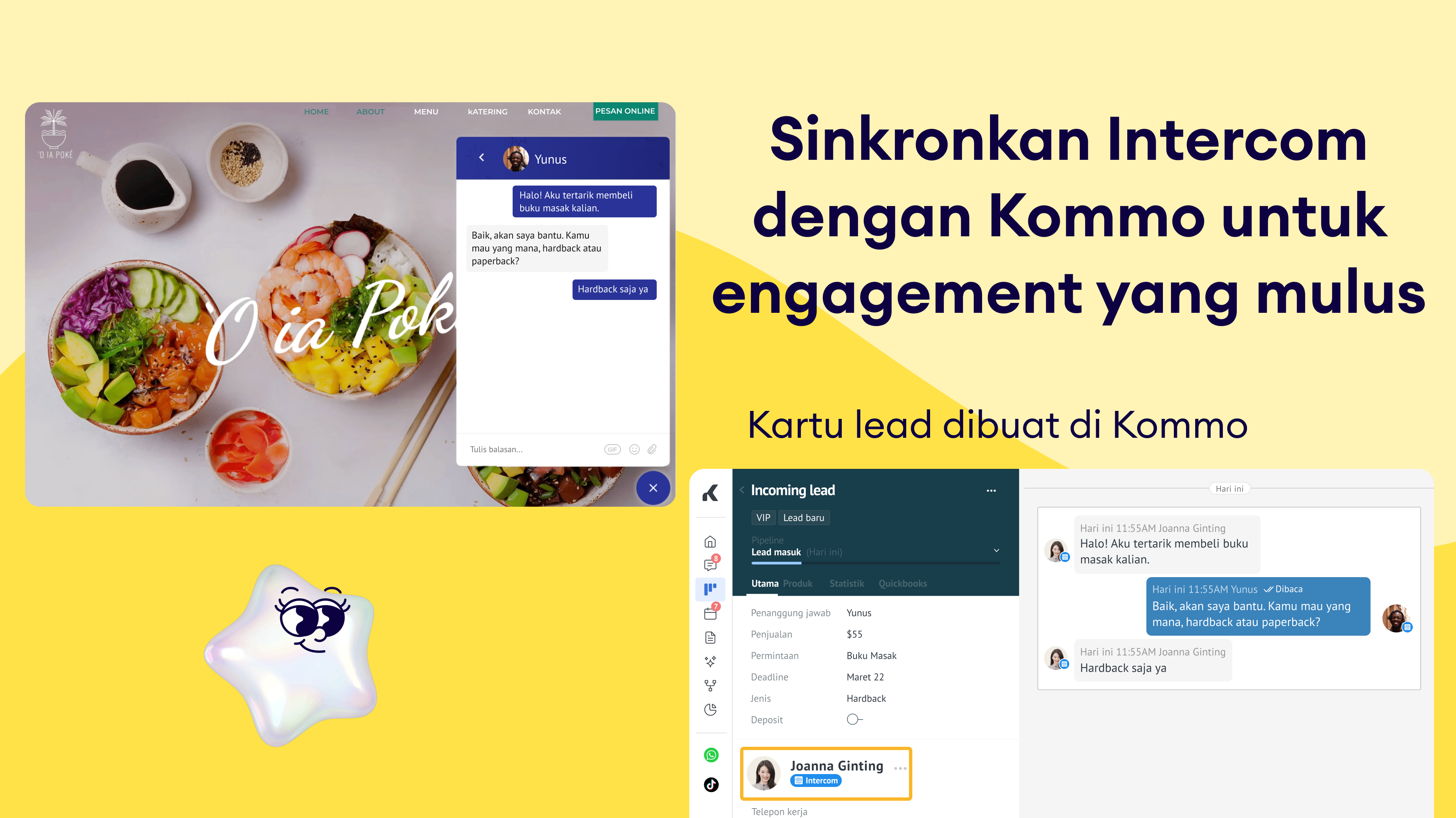 Integrasi Intercom memberikan cara yang simpel bagi pengguna Kommo untuk menyatukan customer support dan sales. Dengan menggabungkan visual pipeline Kommo, kotak masuk terpadu, dan otomatisasi workflow dengan kekuatan messaging Intercom, kamu mendapatkan sistem terpadu di mana percakapan bisa berubah jadi peluang. Dari mana pun pelanggan memulai dialog, kamu bisa merespon, mengotomatiskan tugas, dan menggiring leads untuk maju dalam tahap sales kamu—semua tanpa harus pindah aplikasi.