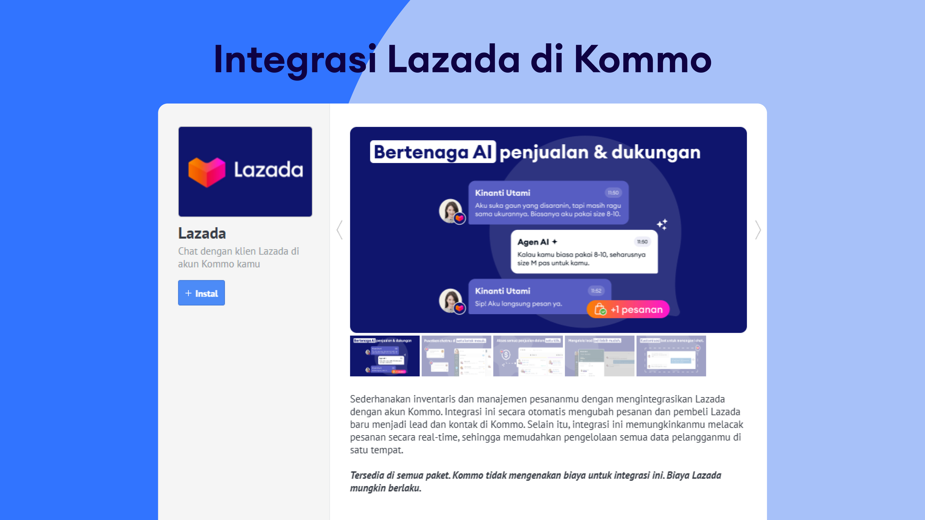 Lazada jadi jauh lebih powerful ketika dipasangkan dengan pendekatan AI-first dari Kommo. Dengan agen AI yang menangani FAQ dan update pesanan, serta Kommo AI yang membantu tim kamu dengan balasan dan insight yang lebih pintar, komunikasi dengan pelanggan jadi lebih cepat dan konsisten. Ditambah lagi dengan visual pipeline Kommo, multichannel inbox, dan otomatisasi workflow, kamu punya sistem yang menjaga sales dan support tetap sinkron sempurna sekaligus meningkatkan efisiensi di setiap langkah.