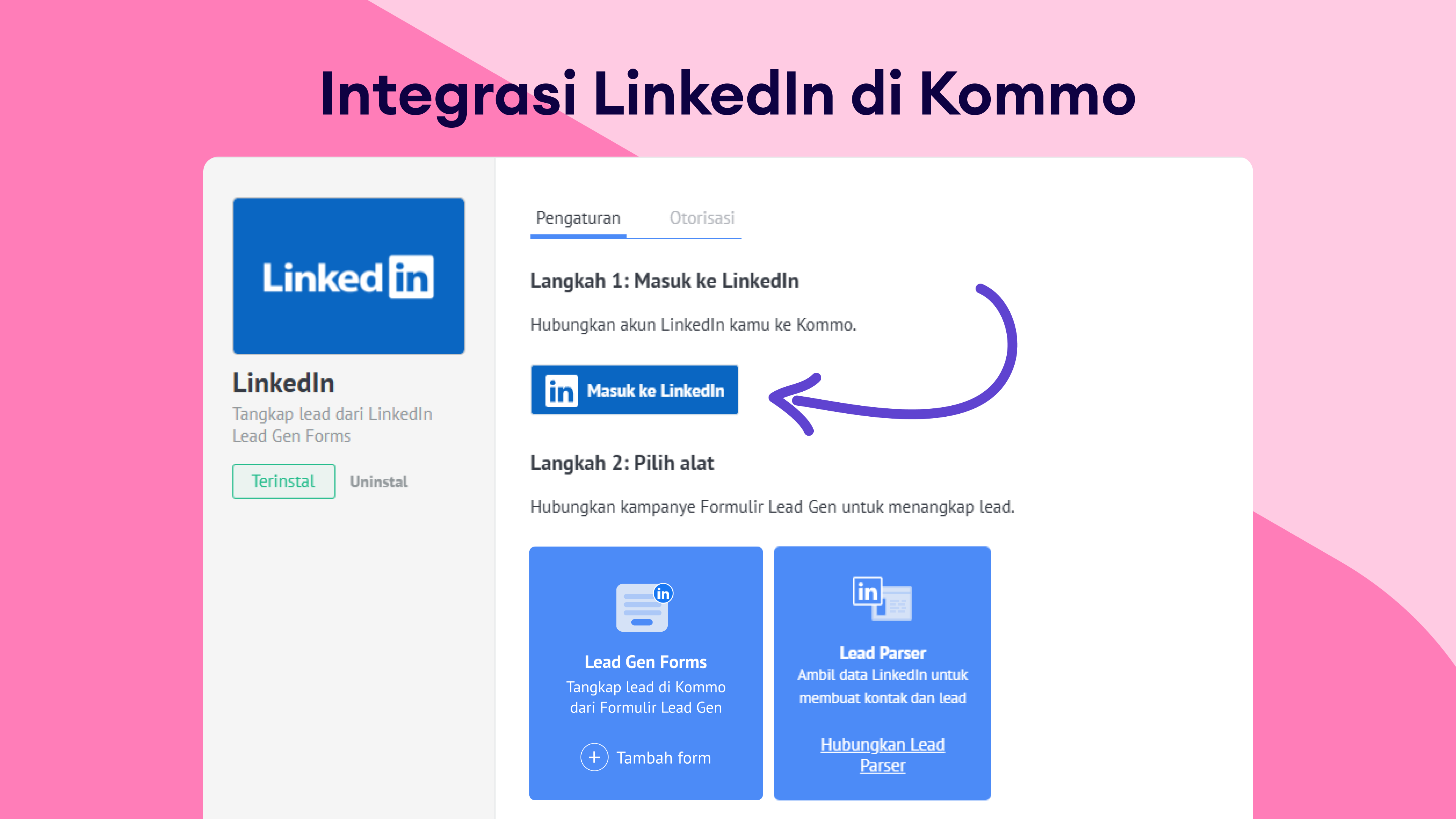 - Di Kommo, buka Integrasi, cari LinkedIn, lalu klik Instal.