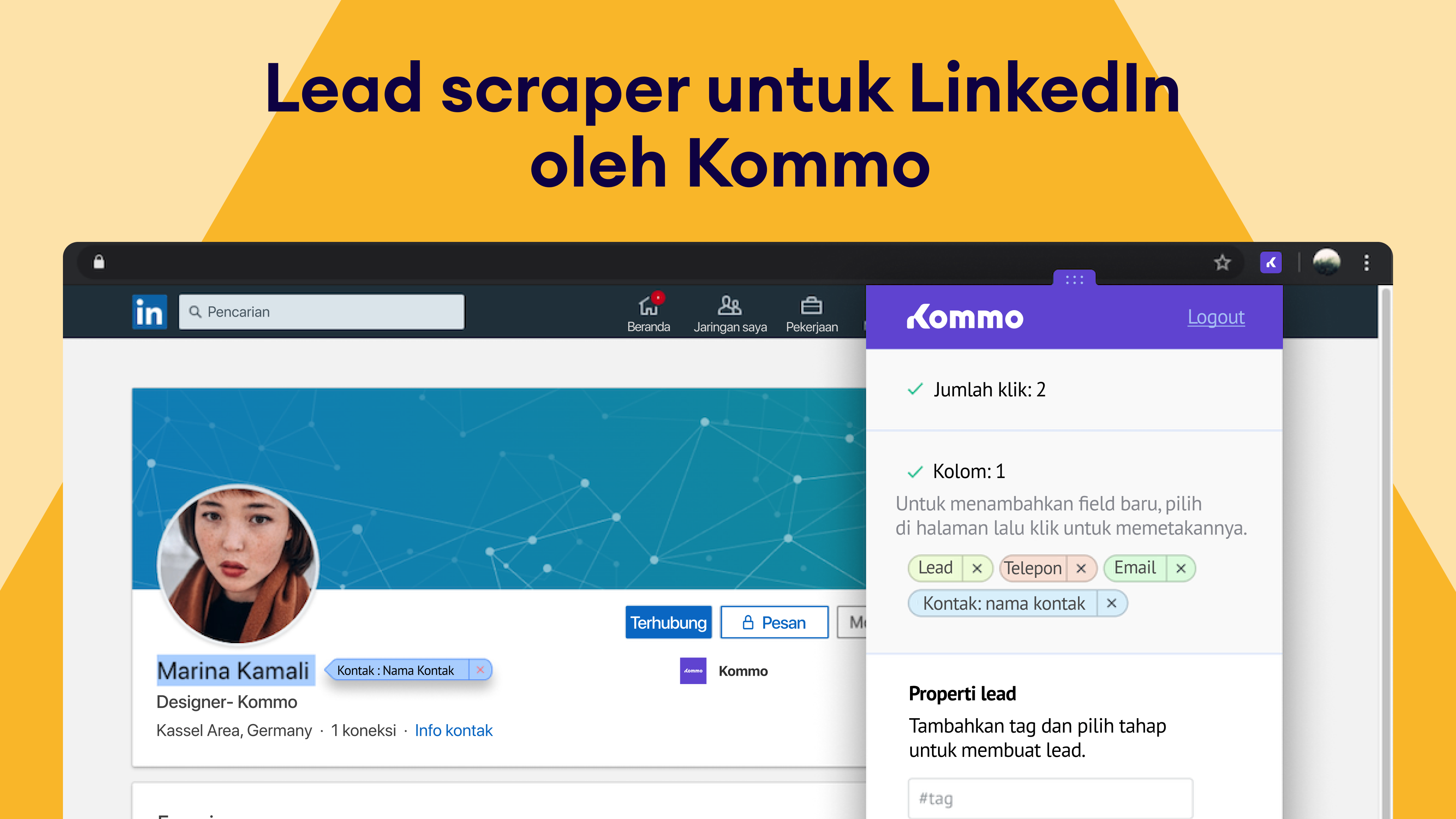 Integrasi LinkedIn di Kommo memungkinkan kamu membuat leads baru dari profil LinkedIn hanya dalam beberapa klik. Dengan ekstensi Chrome Lead Scraper, kamu bisa mengambil detail profil penting, memetakannya ke field/kolom di CRM, dan mengirim setiap kontak langsung ke pipeline untuk dilacak dan ditindaklanjuti. Selain itu, dengan menghubungkan LinkedIn Lead Gen Forms, kamu bisa secara otomatis menangkap leads dari iklan dan formulir, sehingga tidak ada leads yang terlewat.