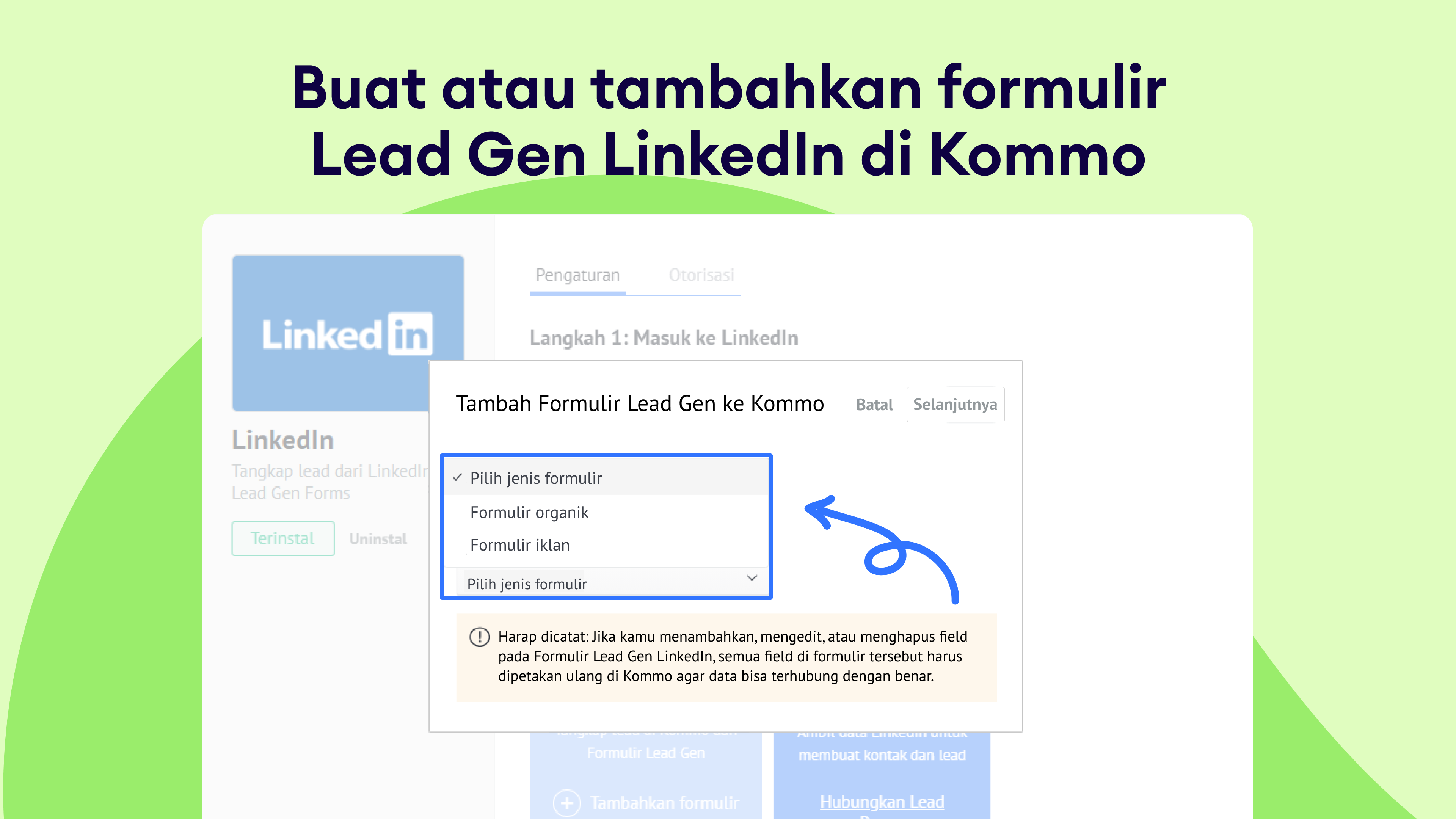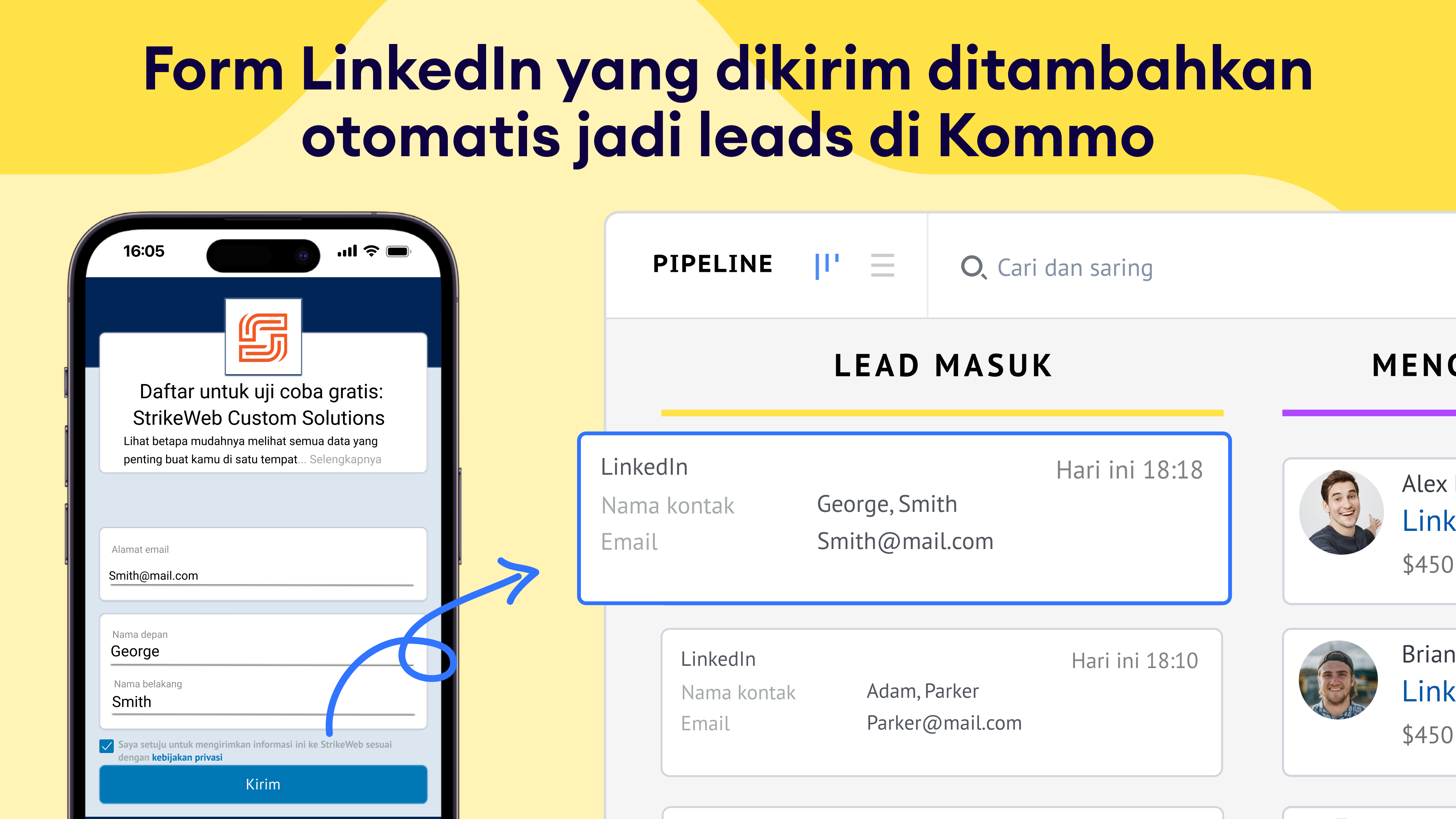 Integrasi formulir: Hubungkan LinkedIn Lead Gen Forms ke Kommo agar lead yang mengisi iklan atau formulir otomatis muncul di CRM.