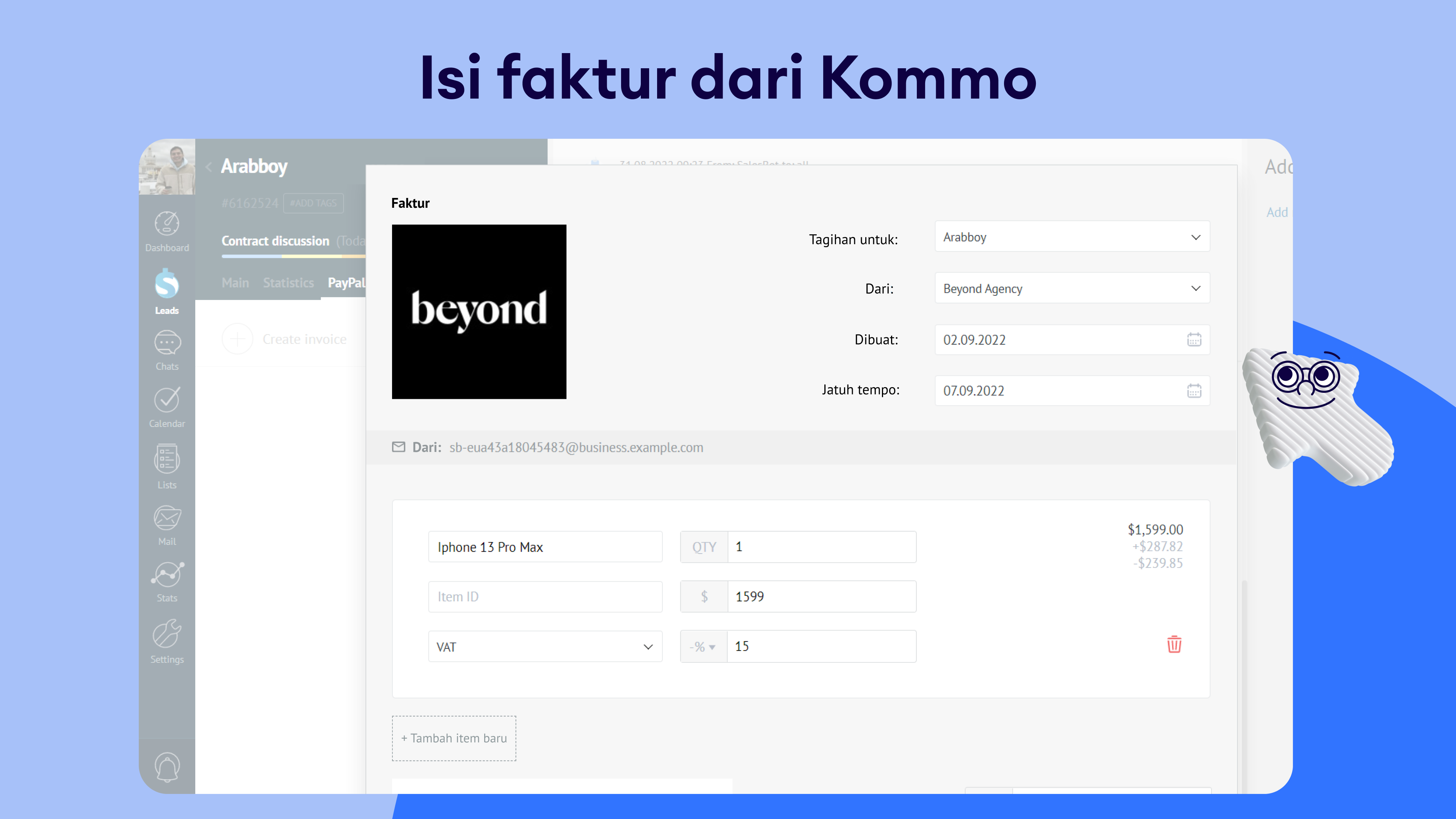 Pembaruan real-time: Setiap pembayaran, pembayaran sebagian, atau faktur yang jatuh tempo langsung tercermin di kartu lead. Tim kamu selalu punya informasi keuangan terbaru tanpa harus bolak-balik aplikasi.