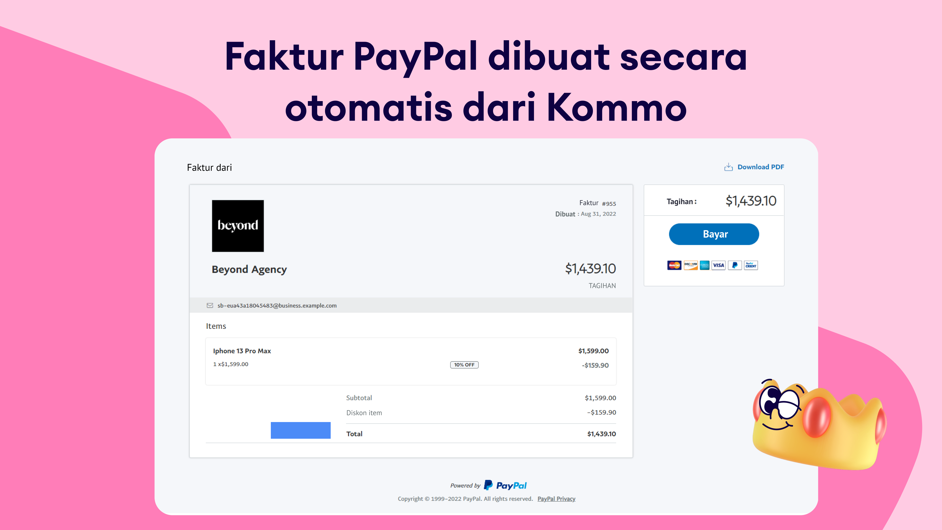 Integrasi PayPal mempermudah penagihan dengan memungkinkan kamu membuat, mengirim, dan mengelola faktur langsung di dalam CRM-mu. Otomatiskan proses pembayaran, pantau status faktur secara real-time, dan gerakkan leads di pipeline-mu berdasarkan transaksi yang sudah selesai. Ucapkan selamat tinggal pada penagihan manual dan sistem yang terpisah-pisah.