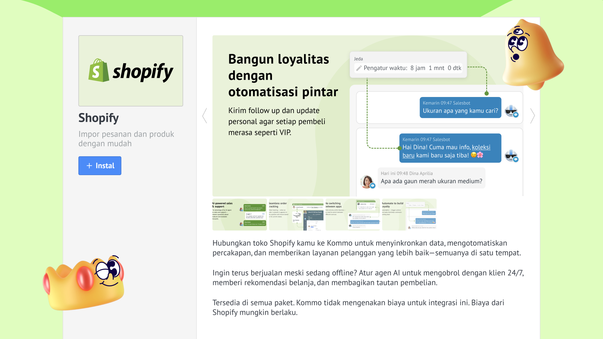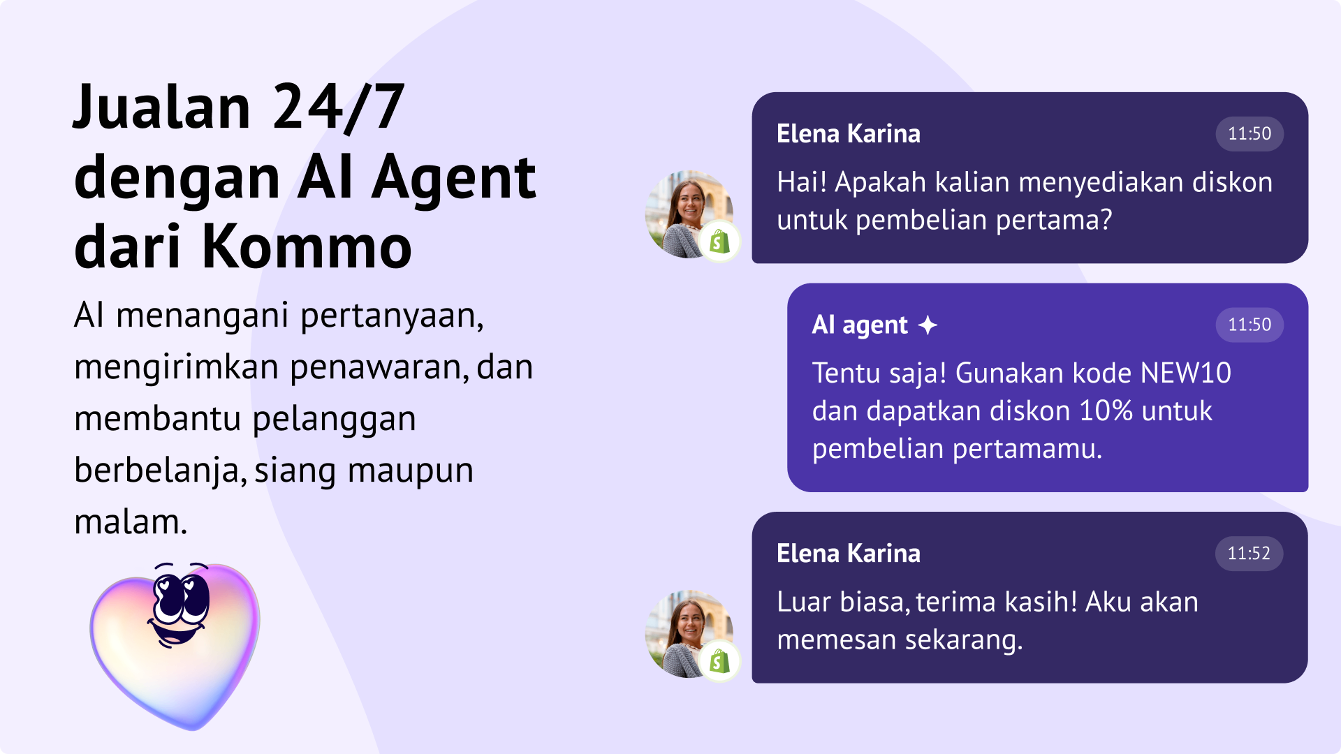 Dukungan pelanggan bertenaga AI: Tambahkan tombol chat Kommo di situs web dengan AI agent yang menjawab pertanyaan secara real-time seputar ketersediaan produk, kebijakan toko, detail pelacakan pesanan, dan lainnya. Semuanya berdasarkan data toko Shopify kamu.