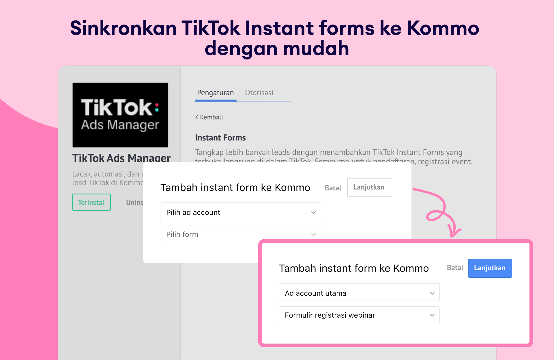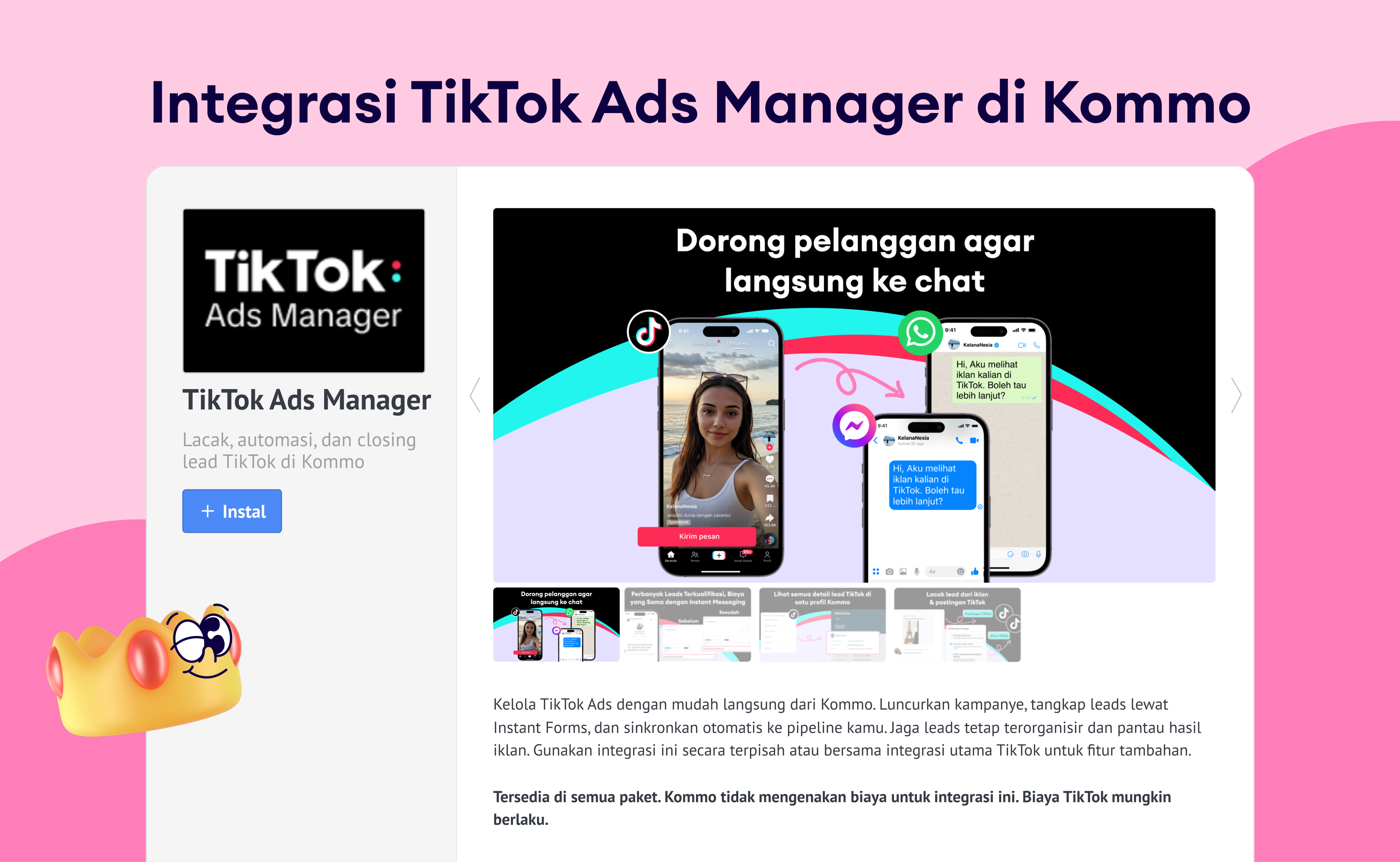 Di Kommo, buka Pengaturan > Integrasi > TikTok Ads Manager lalu klik Instal.