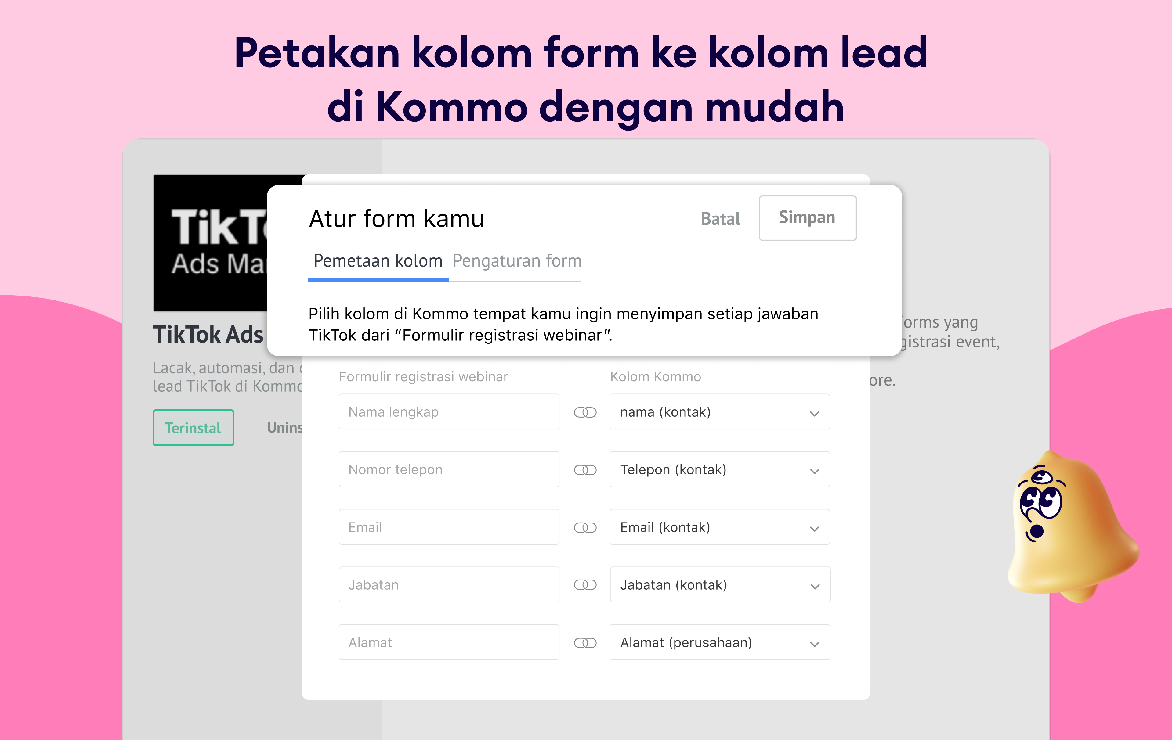 Tambahkan TikTok Instant Forms dengan memilih akun, memetakan kolom formulir ke kolom di Kommo, serta menetapkan tag atau tahap pipeline.
