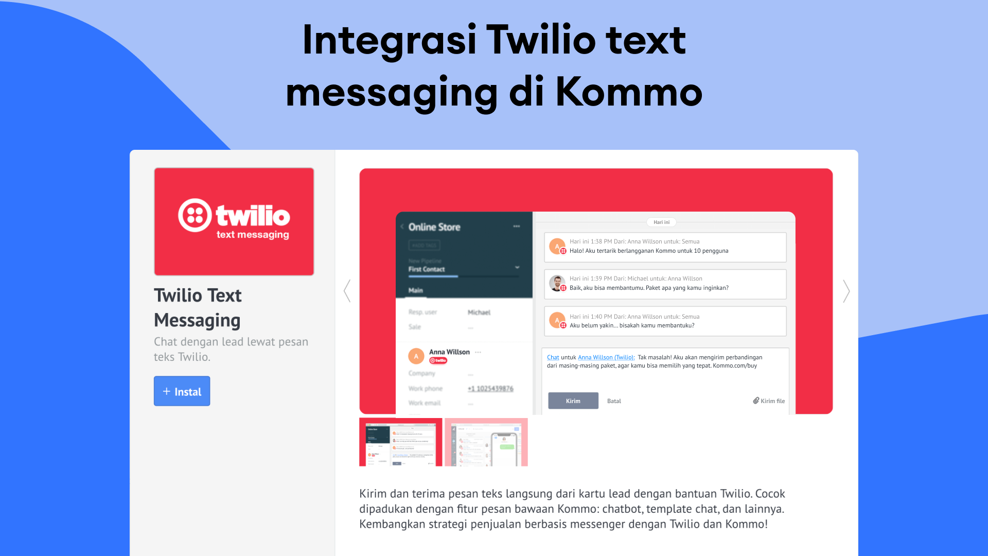 Integrasi pesan teks Twilio di Kommo memungkinkan kamu mengirim dan menerima SMS langsung dari CRM. Dengan menghubungkan Twilio, kamu bisa mengotomatiskan workflow komunikasi, berinteraksi dengan leads secara efektif, dan menyimpan catatan semua interaksi secara lengkap. Integrasi ini meningkatkan kemampuanmu menjangkau pelanggan lewat SMS, memastikan komunikasi yang tepat waktu dan personal.