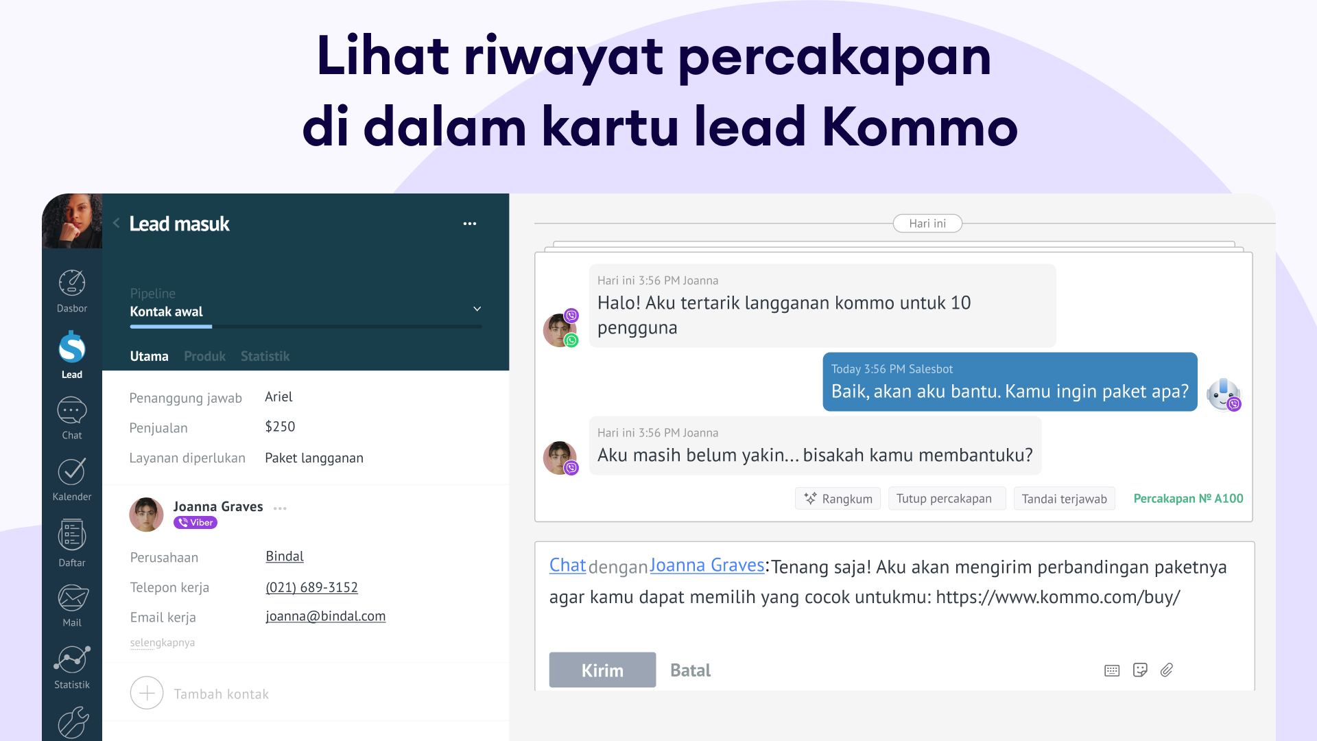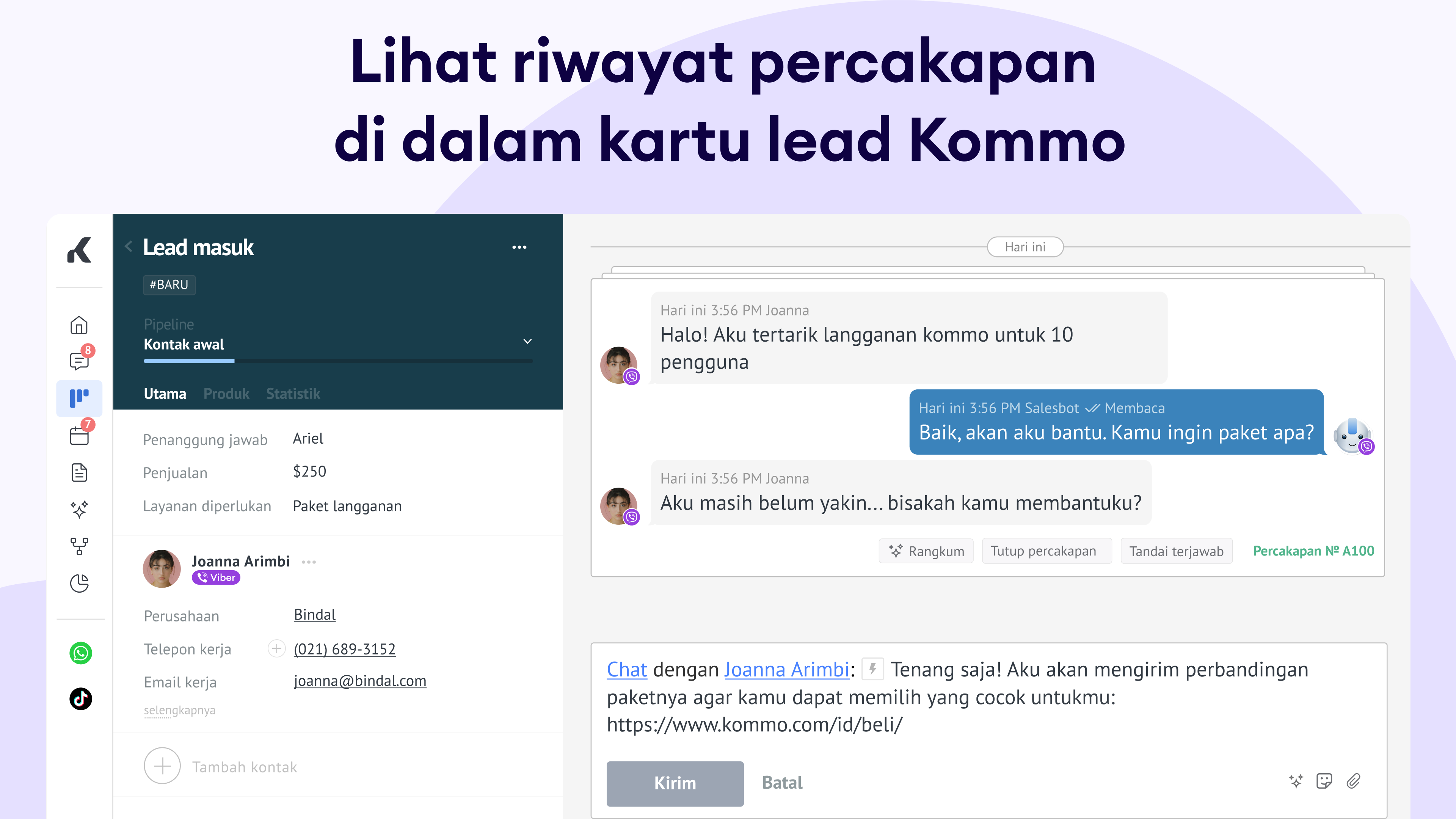 Manajemen chat tanpa hambatan: Balas pesan langsung dari lead card, sehingga semua komunikasi tetap rapi di satu tempat.