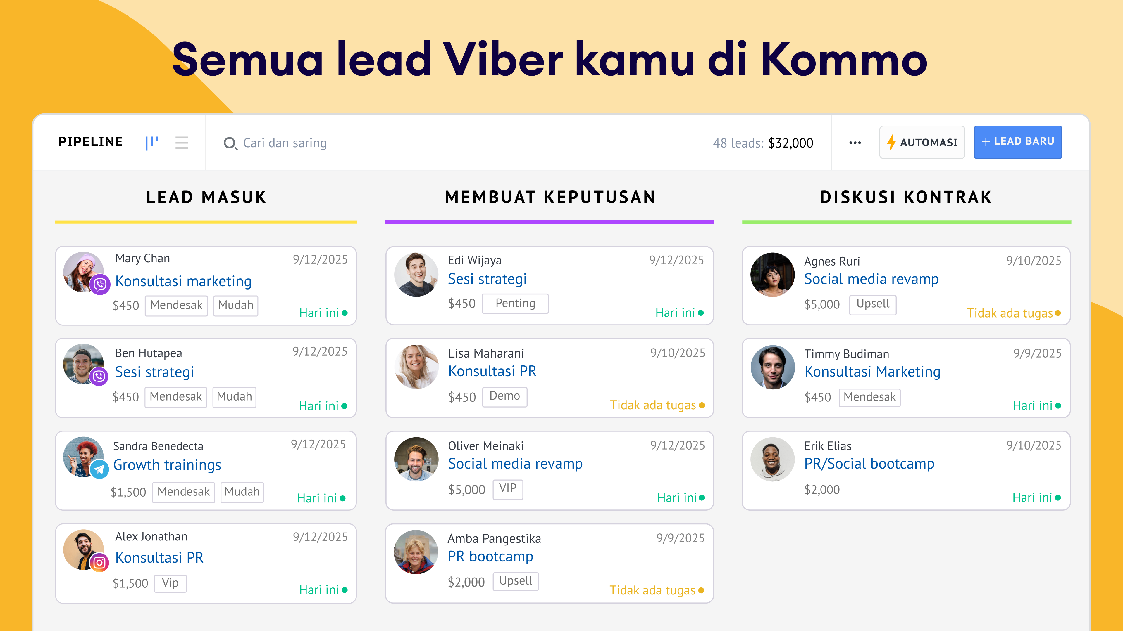 Tangkap leads secara instan: Setiap kali ada pelanggan baru yang menghubungi kamu di Viber, lead akan otomatis dibuat di pipeline—tanpa perlu input manual.
